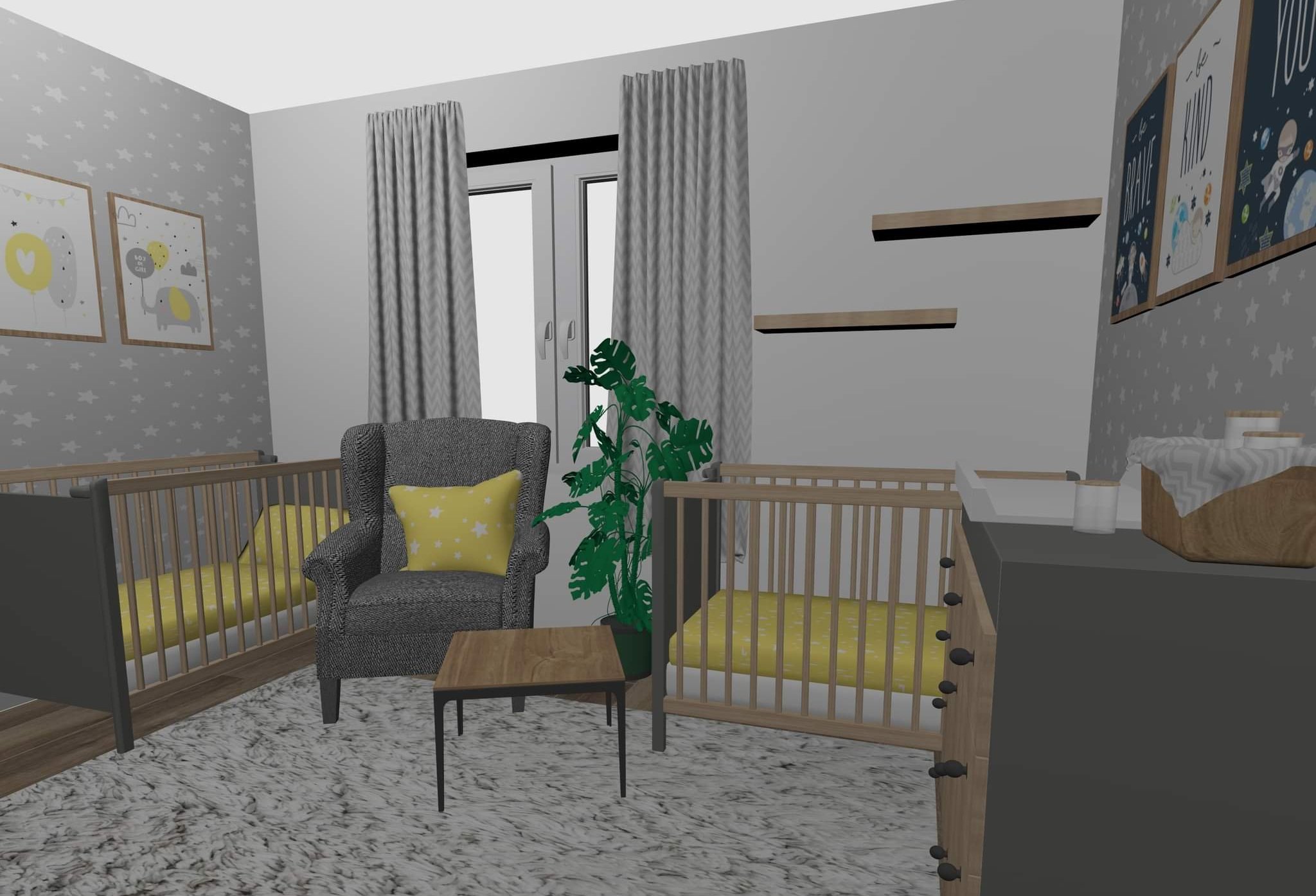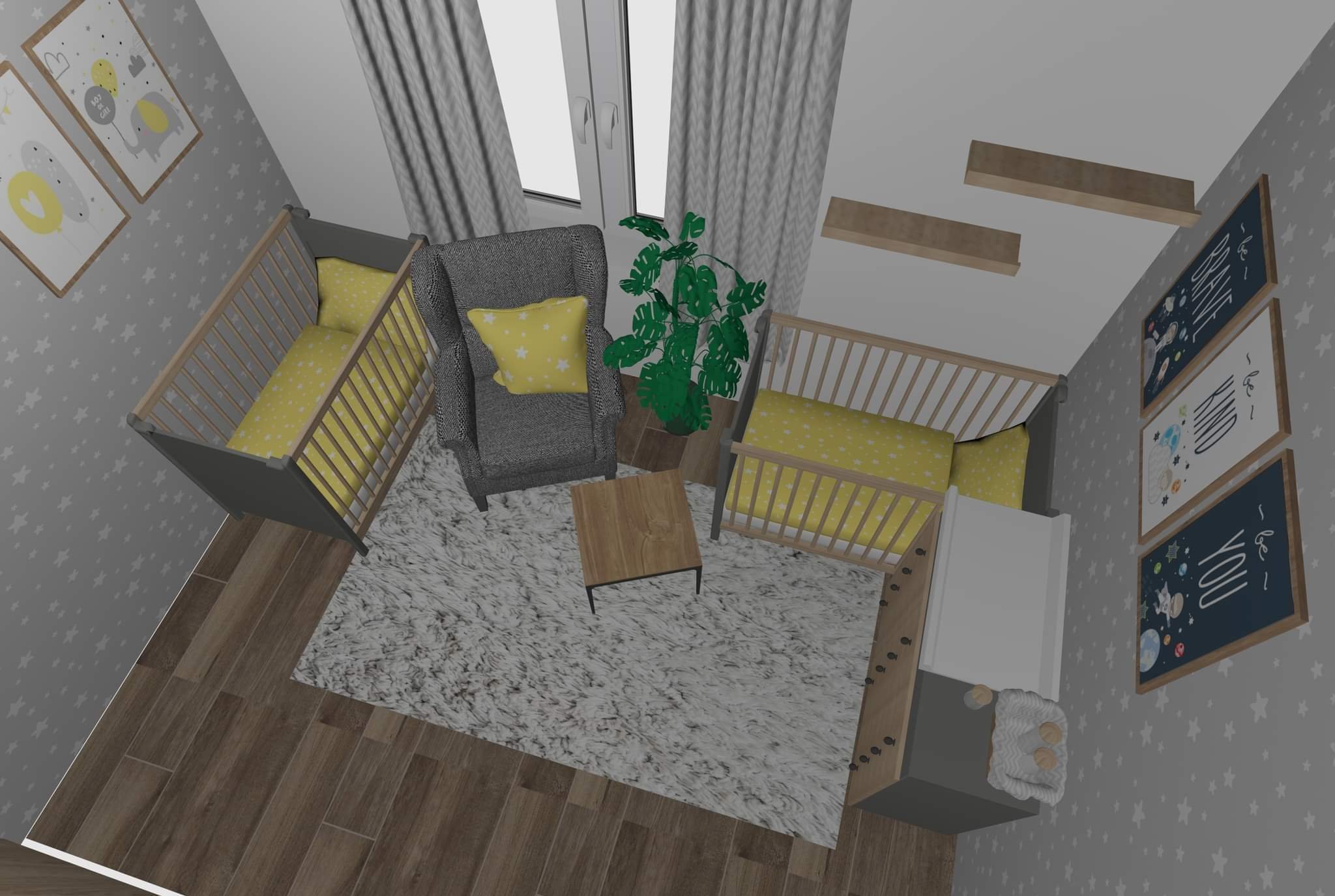 и ще започнем от детската стая. Дизайнер съм по професия и съм направила 3Д модел на целия етаж. Ето и детската стая.