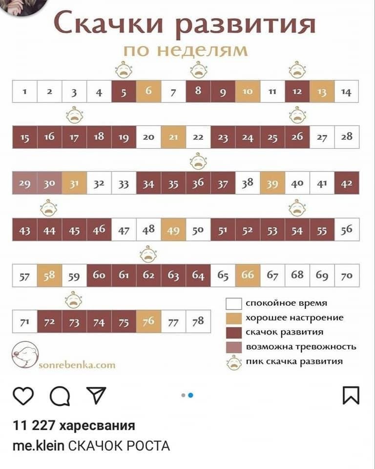 Аз от два скока насам гледам тази снимка. Бройш седмиците от термина по принцип но на мен ми отговаря датат на раждане не термина. Трябва да си прецениш ти за твоето дете. Общо взето гледаш че има скок в 12 седмица. При мен станат ли 11 пълни седмици и дойде 11+1-2 дни (броя ги като гестационните седмици) веднага виждам че е кисела поглеждам снимката и хоп в скок е 😀 Нямам идея по колко пъти в месеца е в скок на мен ми се вижда постоянно всяка седмица без ден-два 😀
