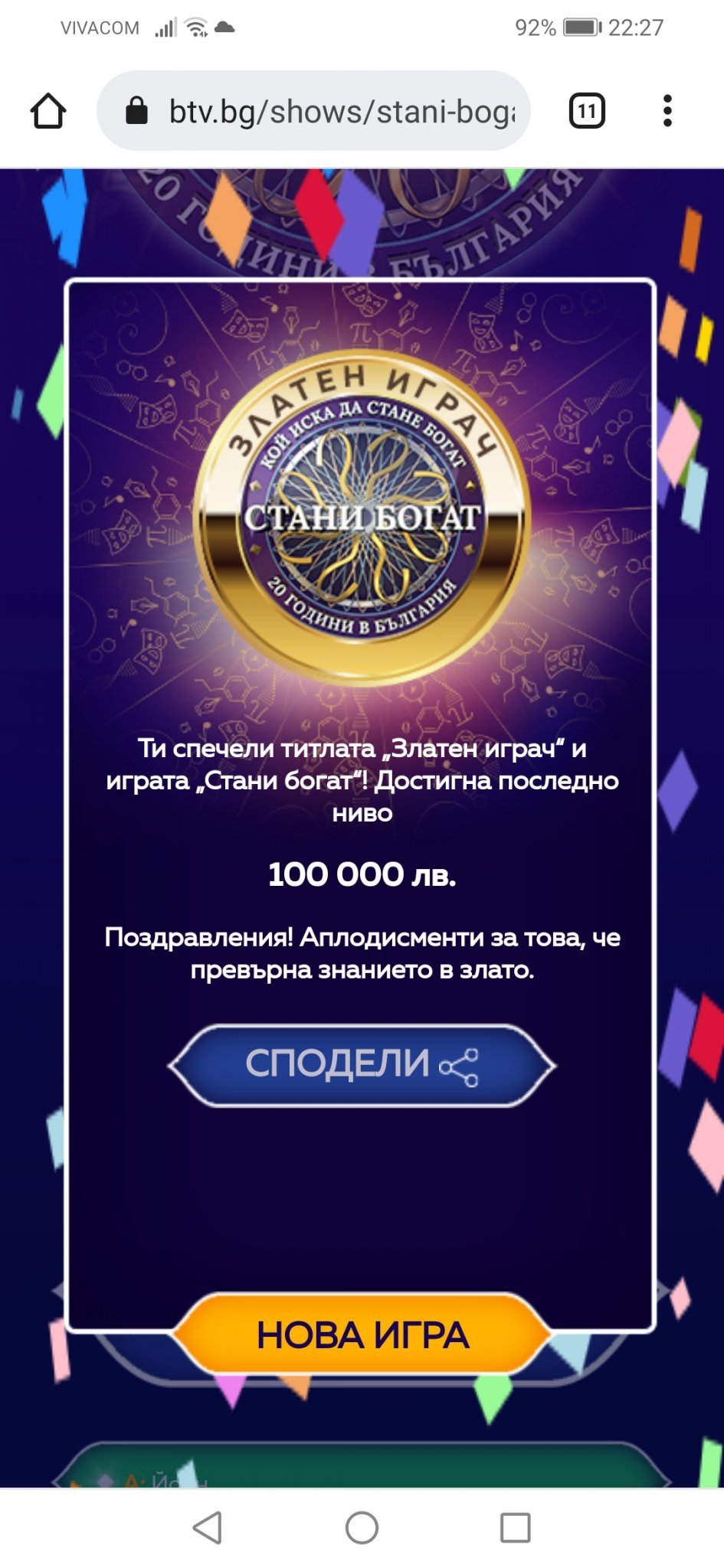 Напълно съгласна, ако не го знае и трябва да търси в гигъл е неудобен. Колкото и бързо да търси човек участникът трябва да съобразява и въпроса , все пак.... да преценя сам кой жокер е по-подходящ. Въпросът на който отпадна беше подходящ за жокер обади се на приятел.
