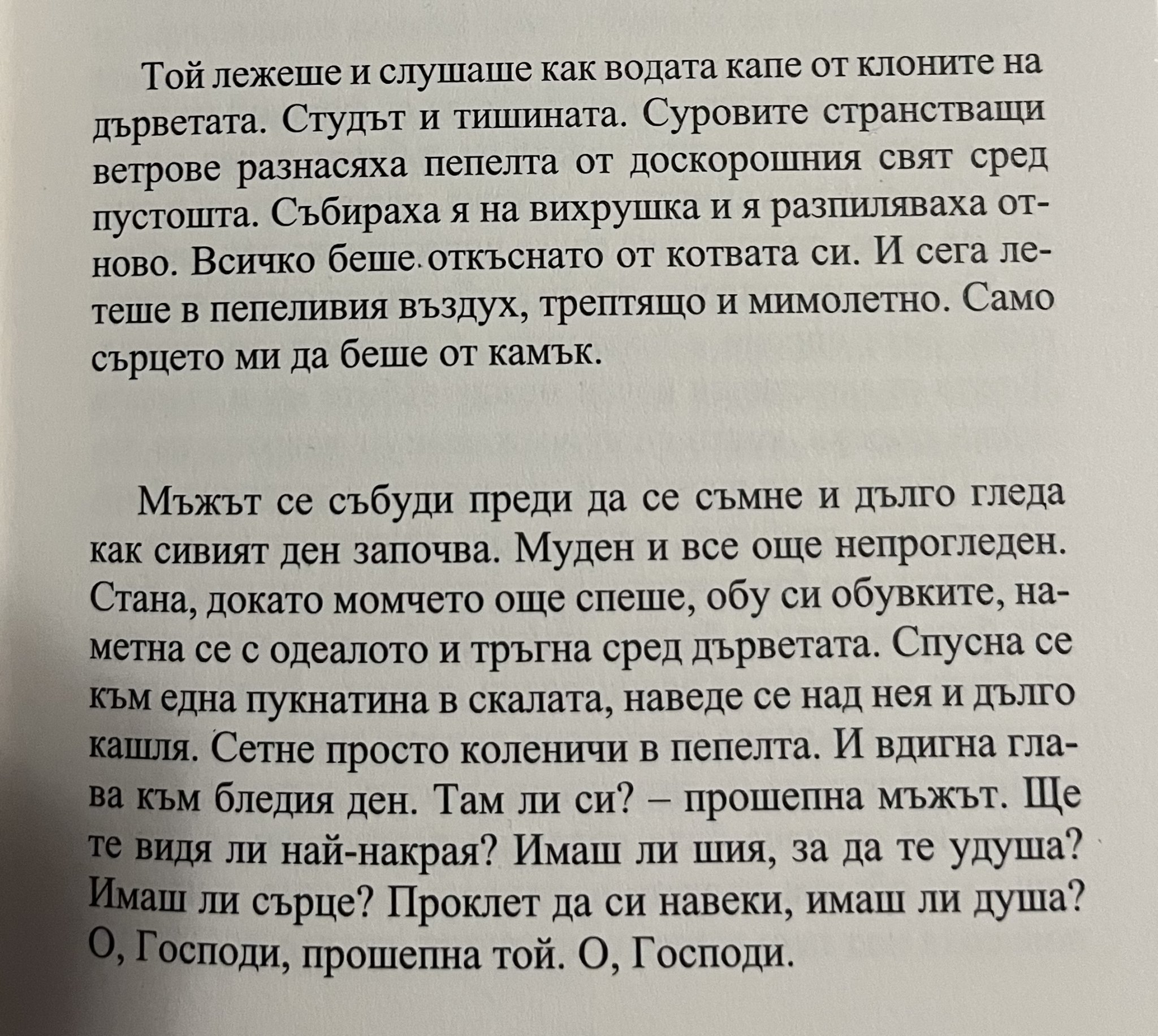""И тук съм пръв" помисли си Л.., като стигна до плувния център "Страхов" точно когато служителят отключваше сградата.Можеше да посочи само няколко по-луксозни преживявания от това да има олимпийски басейн за себе си. Намери шкафчето, което беше наел, обу плувките си "Спидо", взе бърз душ, грабна очилата си за плуване "Ванкуишър" и отиде при басейна.