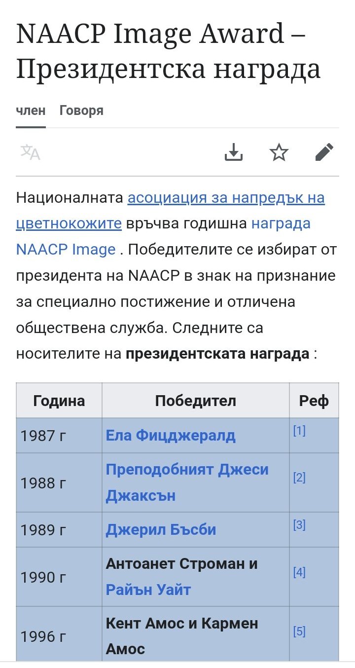 Националната асоциация за напредък на цветнокожите връчва годишна награда NAACP Image . Победителите се избират от президента на NAACP в знак на признание за специално постижение и отличена обществена служба
