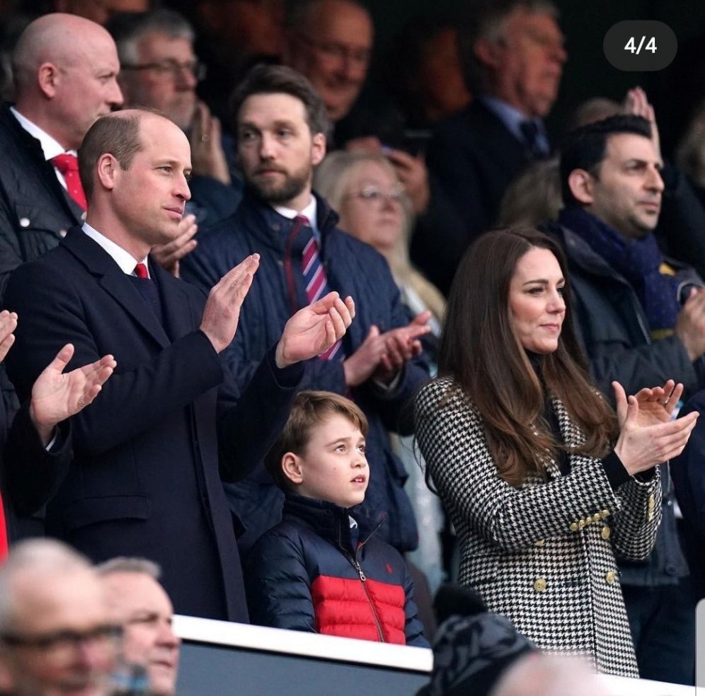 Херцогът и херцогинята на Кеймбридж и принц Джордж на трибуните на Twickenham Stadium, Лондон
