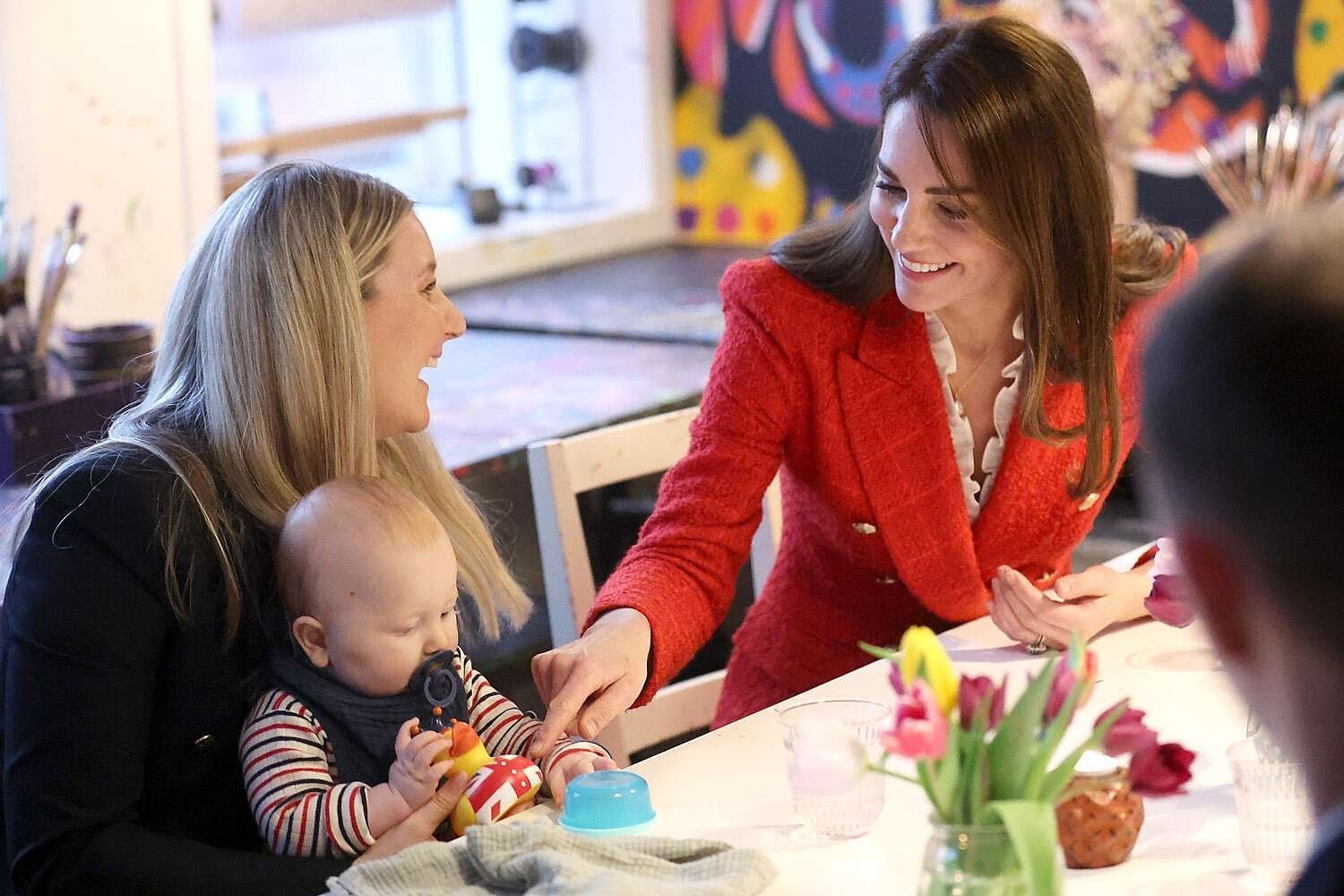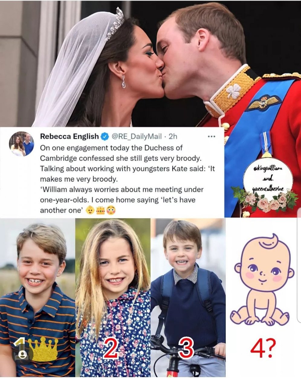 Това ме прави много замислена", призна Кейт по време на излизането. "Уилям винаги се тревожи, че ще се срещам под едногодишни деца. Прибирам се вкъщи и казвам: „Да си направим още едно бебе“. „Уилям се пошегува за перспективата Кейт да иска още едно бебе миналия месец по време на посещението на двойката в Ланкашър. Докато правеха снимки с някои семейства, двойката се срещна с Труди и Алистър Бари и дъщеря им Анастасия. Кейт държеше момиченцето, докато позираха за една снимка. снимка, която кара зрителите да гукат и кара принц Уилям да се пошегува: „Не давайте на жена ми повече идеи!“ Докато Кейт връщаше бебето на родителите си, Уилям се пошегува: „Не я вземай със себе си“.