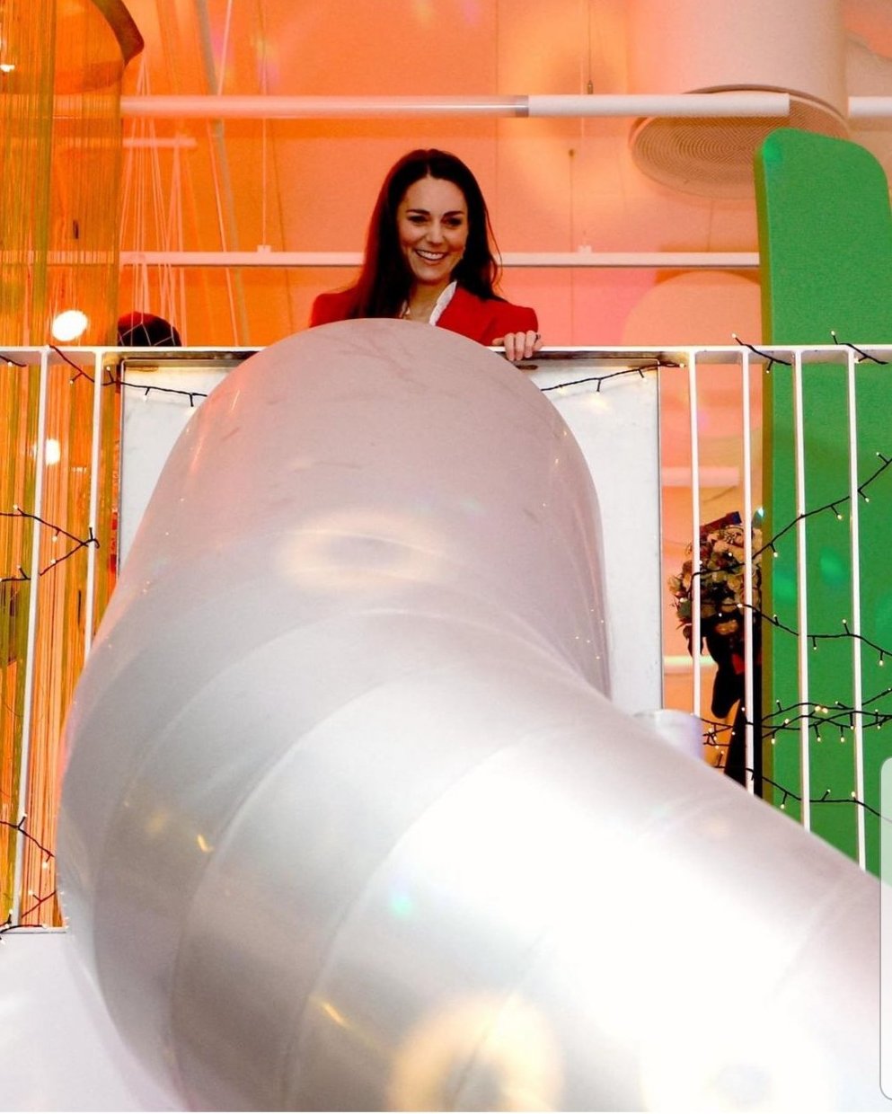 Кейт на детската пързалка тунел ми е инфантилно. Тъпа идея да я карат да се пуска по нея. Хората отстрани доста резервирани ми изглеждат.