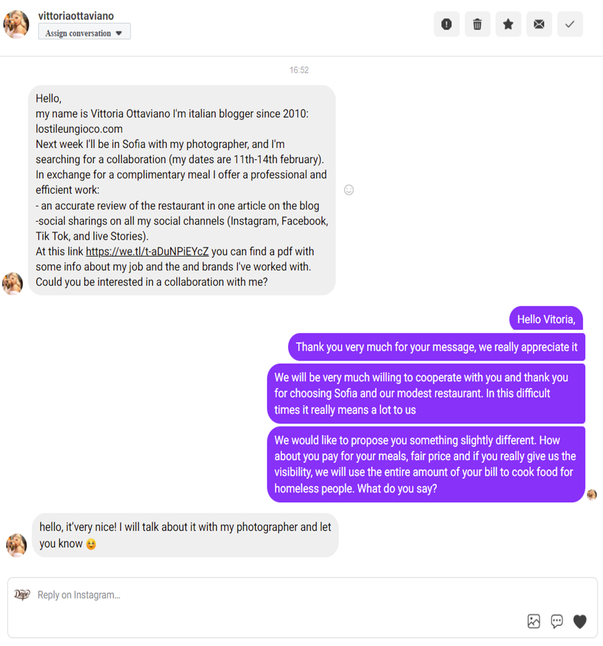 Италианска блогърка иска колаборация със софийски ресторант, т.е. безплатно изхранване, но от ресторанта ("Даро", на Ангел Кънчев 20) ѝ отправят контрапредложение Sunglasses