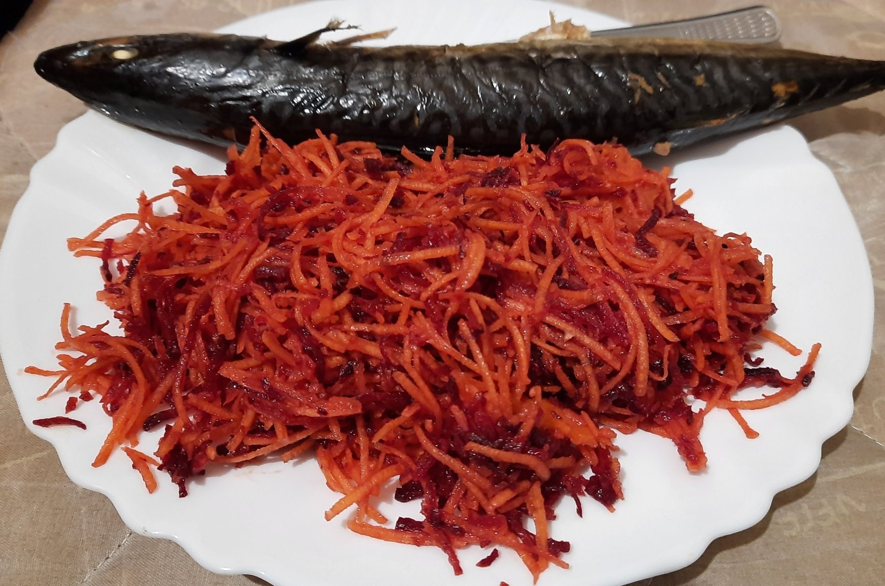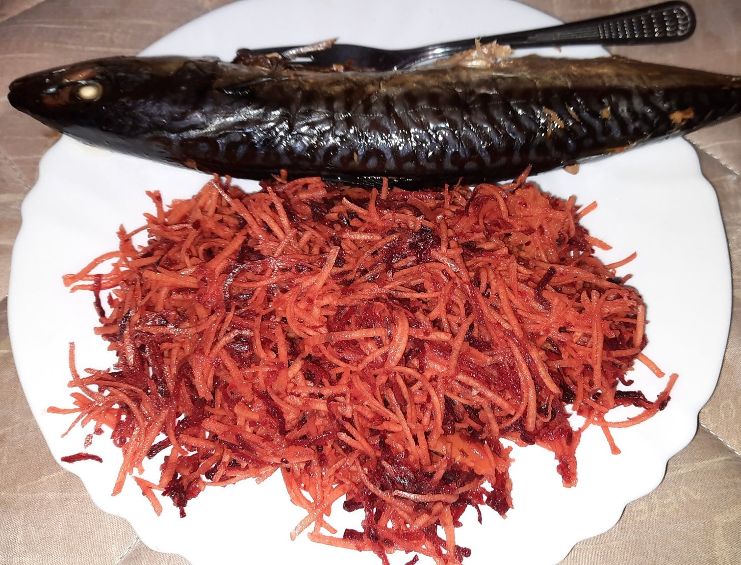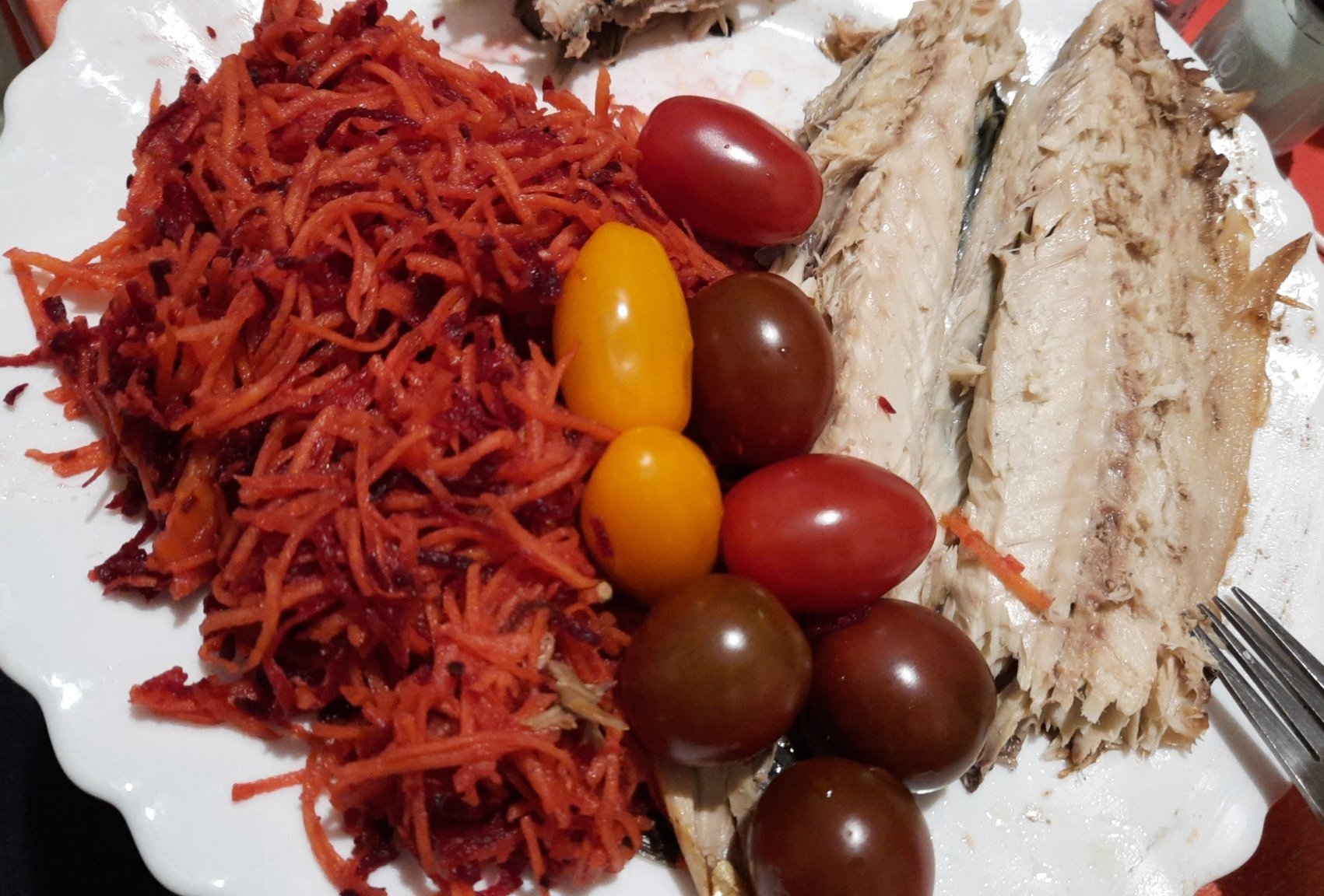 Да дам отчет за скумрийката- вкусна беше, и малкото капризче одобри. 😉 Салатата беше от моркови и червено цвекло и малко черита: