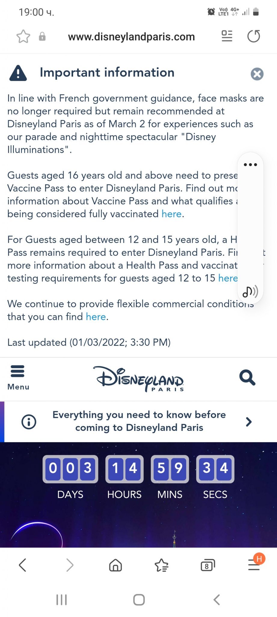Здравейте, планувала съм ходене до Дисниленд за мен и дъщеря ми на 13 г за следващата седмица, имам самолетни билети,  датирани билети за парка, хотел и т.н. Четох сто пъти изискванията в сайта на Disneyland Paris за вход, обаче не ме пуска страха, че нещо не съм разбрала и може да ни върнат. Имаме сертификат за преболедуване от края на януари, т.е. изглежда като да отговаряме на изискванията.