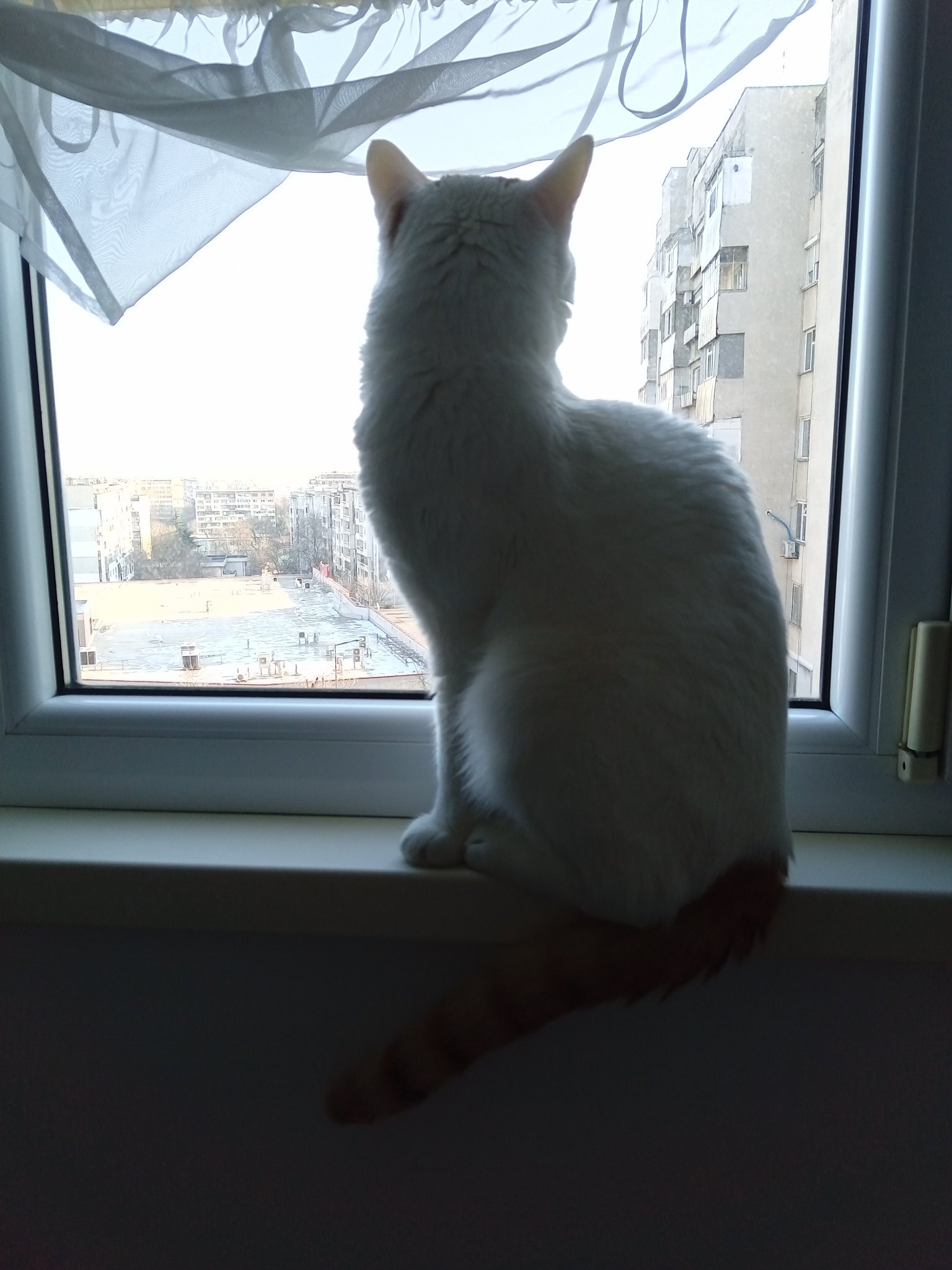 Чудя се как ще караме лятото..Днес отворих вратата на терасата. Див веднага прояви любопитство. Души, мяука и по едно време го гледам , алпинист по комарника.  Комарника сега издържа, но след 2-3 месеца, едва ли. После затворих вратата и я оставих открехната на горен механизам. Пак проблем. Качи се на парапета на прозореца, който е до вратата и си навря главата в отвора..Мисля, че с желание, може да се навре целия между вратата и комарника..