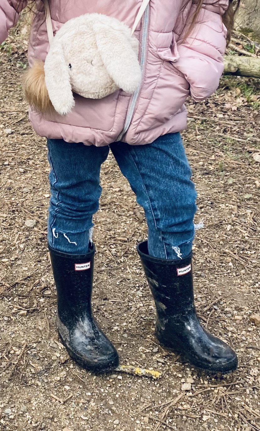 Нося ги само с децата в парка, дори и да не вали, ако вчера е валяло, гаранция предполага гумени ботуши. Също ако си собственик на куче е задължително. Даже днес си ги носих на разходката из един резерват. И на мен и на дъщеря взимам само Hunters. Това е малката от днес, няма с какви други обувки  да си позволиш тази кал: