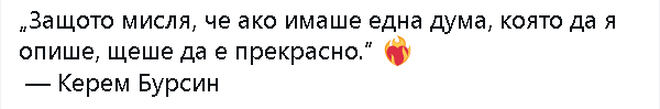 Здравейте момичета, чета ви и само се ядосвам. Може ли тази прекрасна и влюбена двойка така да ни тревожи. Всеки път когато влизам в темата, влизам със страх. Очаквам хубави новини да ги видя засмяни прегърнати, а то пак нищо. Мисля си дали пък няма лек флирт от страна на Керем и Ханде да е побесняла. И двамата ги имам като мой деца толкова ме боли. Чакам и се надявам, дано нещо стане, дано си спомнят за красивите си дни заедно. Аз нямам друга информация за тях освен вашата и много ви благодаря за това. Пишете ни. Бъдете здрави, радвайте се на живота, той е прекрасен.
