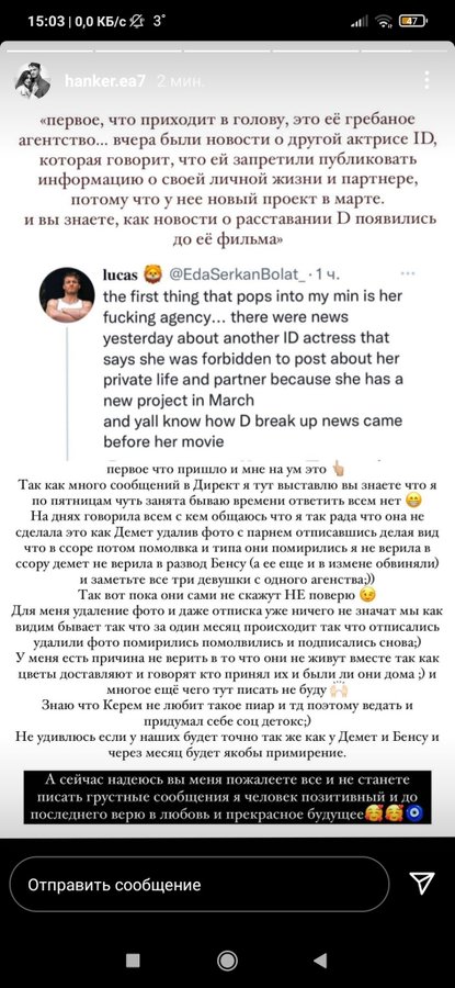 Миси, харесва ми написаното, няма да лъжа. Но ми изглежда като измислица на феновете, които не искат да приемат раздялата като факт. Просто ми е безумно това - да се разделят за пред хората. Пак ще го напиша - Керем и Ханде не ми приличат на хора, които ще играят такава игра, каквато и да е причината. Ще поживеем и видим, разбира се. Но и аз смятам да си взема почивка от социалните мрежи и от темата за връзката на Ханде и Керем. Simple Smile