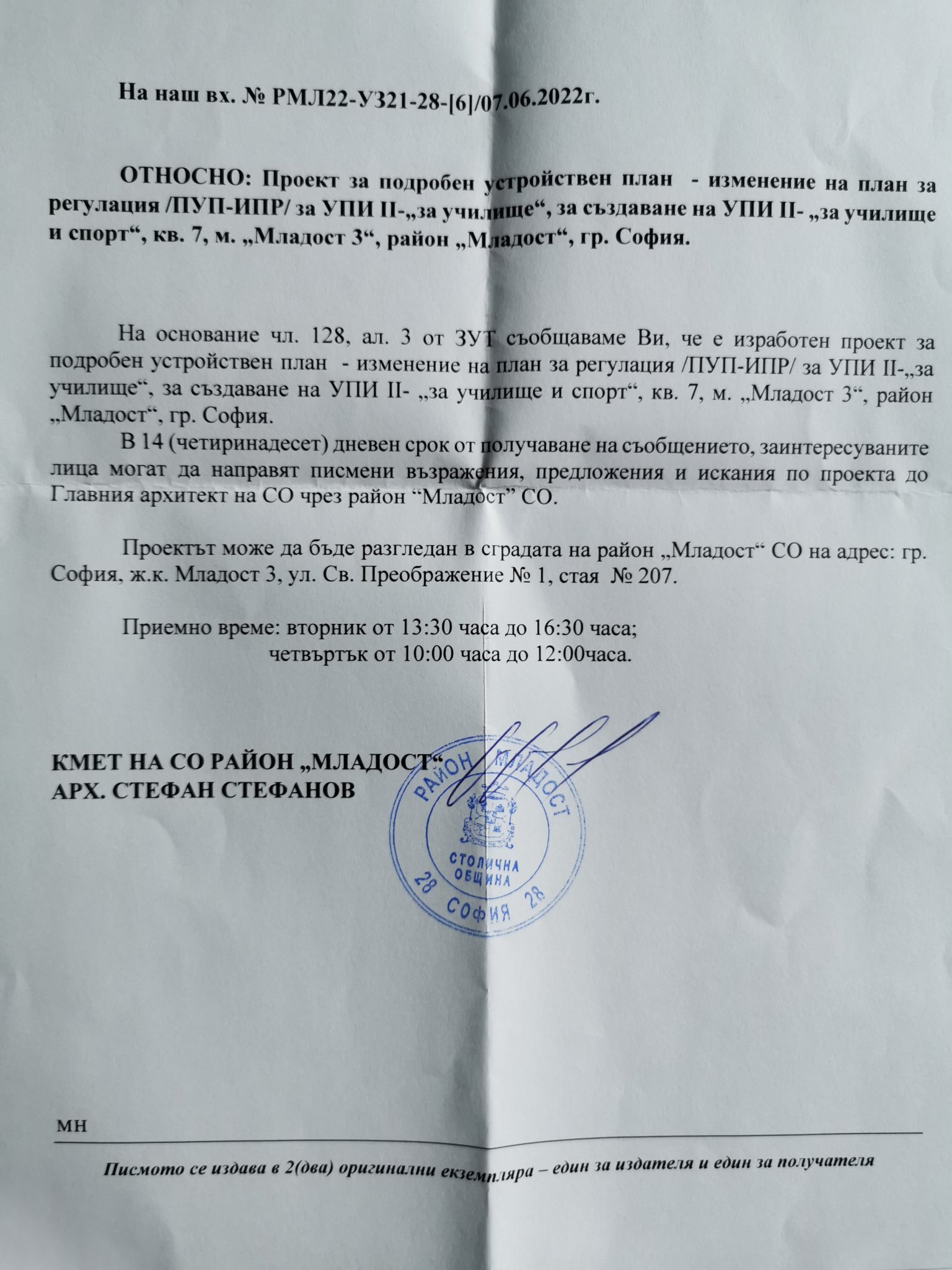 Нямам идея, много набързо говорих с един афектиран съсед, докато ми даваше писмото, ще видя евентуално да ида до общината да видя проекта.