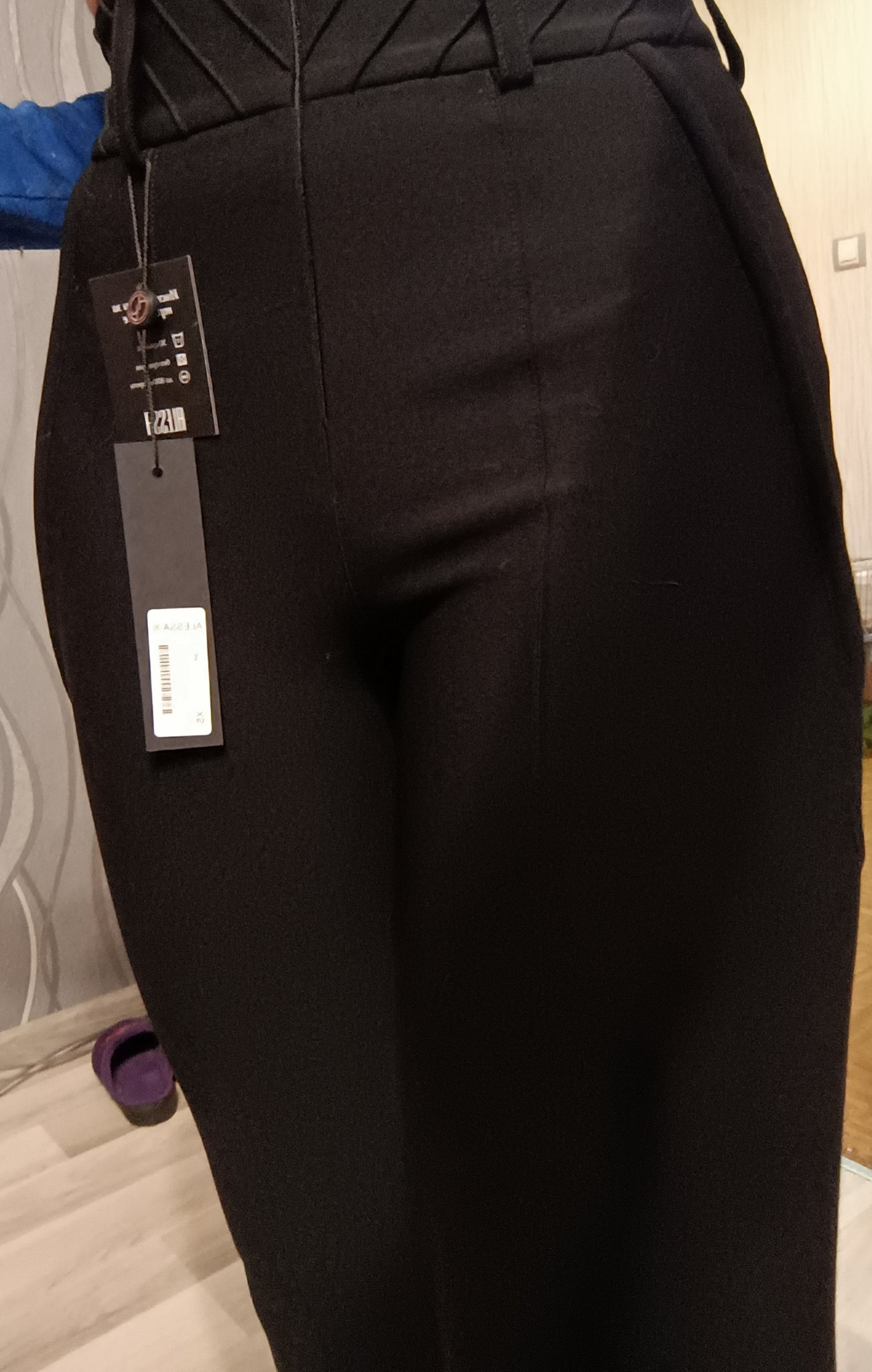 Ето друга снимка...сега като го гледам втори път, повече прилича на клин, отколкото на панталон. Тънък е, но горе заради детайлите е някак по-дебел и ми прибира корема. Материята е някак леко шумкаща, наситено черен е, макар да не личи на снимката...иначе имам официален панталон от Стилна жена, пак е полиестер, но е много много по-различна материя, нищо общо, но това все пак е прилепнало по тялото, трябва да е по-еластична материята. Не знам, аз много не съм наясно и не ми прави впечатление по снимките, на Мими седи някак по-матов от този, който сте качила....леле сега се чудя дали да не върна и моя 😅