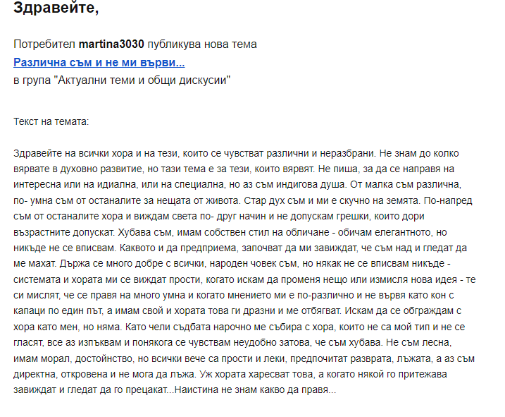Не е справедливо да се трият толкова полезни теми. Аз например разбрах, че не съм толкова красива, колкото си мисля, защото не съм забелязала всички да ми завиждат Confused