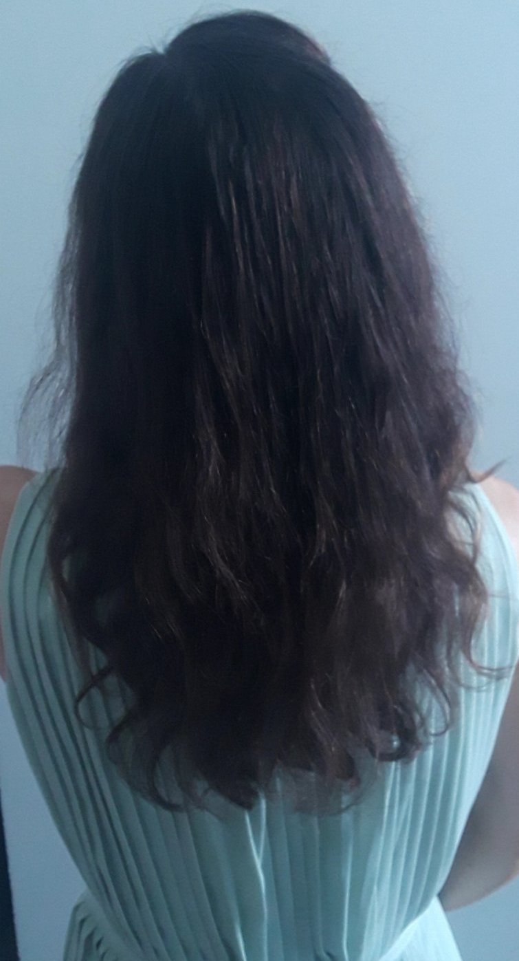 Първата снимка е от септември. Скъсих косата с десет сантиметра след това. Втората снимка направих вчера на същото място, за да се сравни по-добре, но косата е малко влажна. Тъй като на първата нищо не бях ползвала след измиването и на втората не се изсуших.