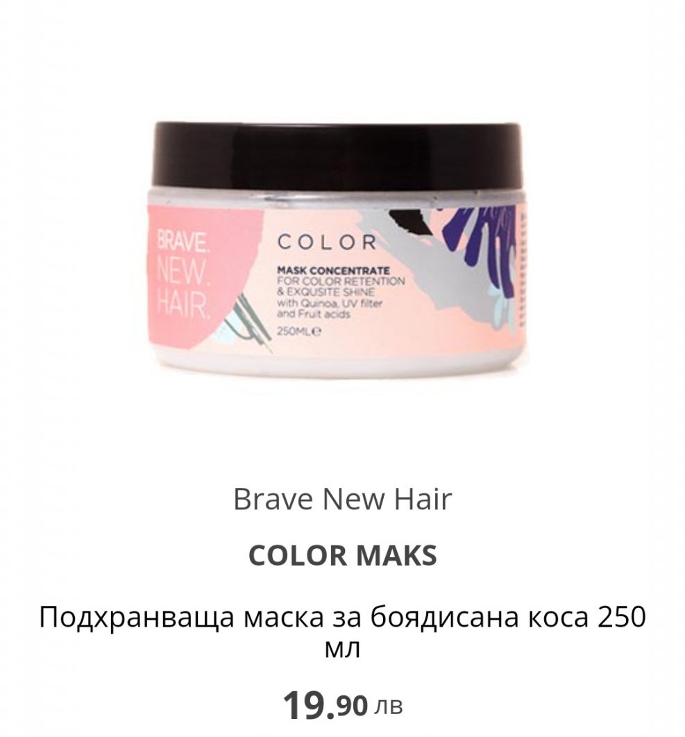 Използвах бои и коректори на Lakme. Цвят 1/2 - 6/13(Тъмно Русо пепелно златист), и 1/2 - 7/00 (Средно Русо). Добавих син и зелен коректор + колорплекс. Оксидант 2/3 - 5,4%, и 1/3 - 8,4. Колебаех се кой оксидант и каква пропорция, затова реших да сложа и малко по-силен. Косата изобщо не е изтощена. Стоях около 45 мин. Стана доста тъмна след първото измиване, направо си беше черна. Мисля, че прекалих малко с коректорите, леко синееше. Grinning Но пък сега е наистина тъмно сива, без гадни ръждиви оттенъци,които напоследък ме преследват. Корена не го боядисвам, тъй като моят цвят е тъмно пепелно русо и затова търся същия или една идея по-светъл цвят, а и така не горя косата в корена. За трайност ще споделя по-нататък, но определено за следващото боядисване ще взема и по-светлото пепелно. Поръчах боите на 13.02 и за да мога да се възползвам от - 14% трябваха още около 20 лв да добавя към поръчката и реших да е някаква маска за боядисана коса, около този ценови диапазон. Поръчах тази от снимката по долу. Грабна ме това, че е българско производство и имаше положителни коментари. Наистина маската е много хубава. Косата ми става изключително лигава, мека и стои здрава. А и на тази цена е доста по-добра от много други тройно по-скъпи, които съм пробвала.