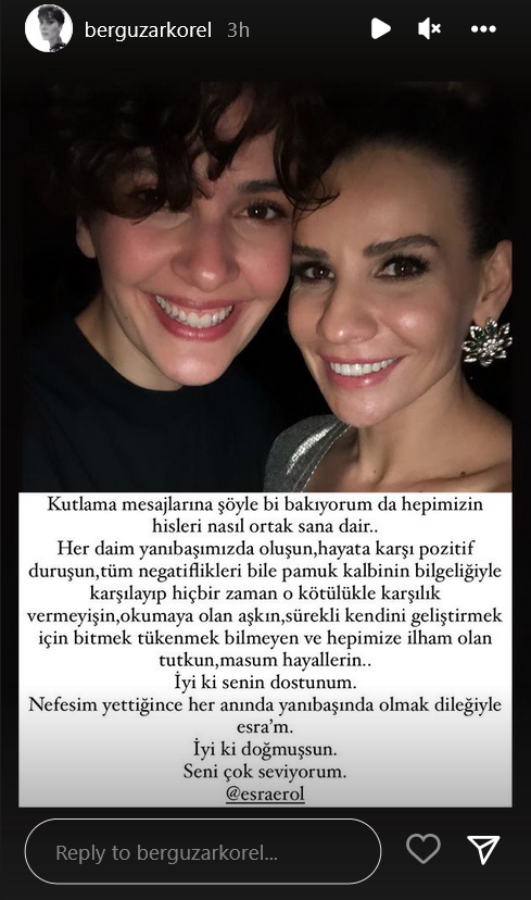 Я смотрю на поздравительные послания тебе и вижу, как мы все чувствуем в тебе партнера .. То, что ты всегда была рядом с нами , твоя позитивная позиция по отношению к жизни , то, что ты воспринимаешь весь негатив с мудростью своего хлопкового сердца и никогда не отвечала на это злом . Твоя любовь к чтению , твоя бесконечная и вдохновляющая страсть ко всем нам , твои невинные мечты о постоянном самосовершенствовании .. Хорошо, что мы с тобой друзья. Надеюсь быть с тобой в любой момент, пока я могу дышать, моя Эсра . Хорошо, что ты родилась .