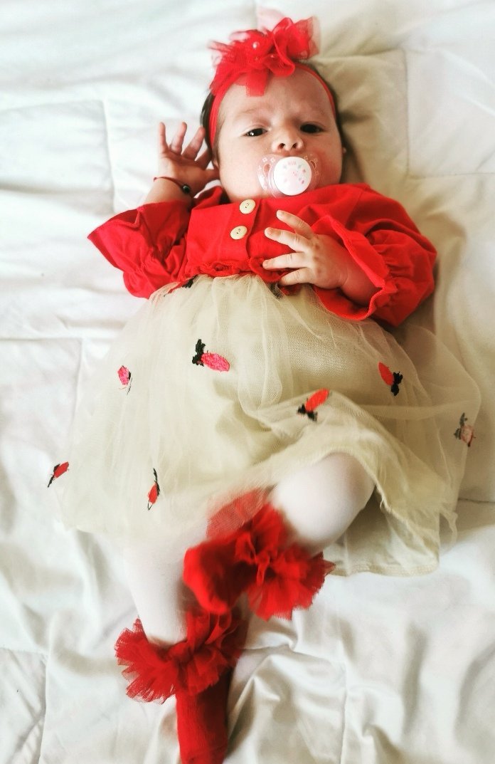 Вече не й стават дрешки, които са за 2-3 месец. Аз съм много щастлива обаче, защото с брат й имах всички възможни проблеми с кърменето. Мечтаех си да е само на кърма и да наддава добре. Е, сега ми се сбъднаха мечтите.