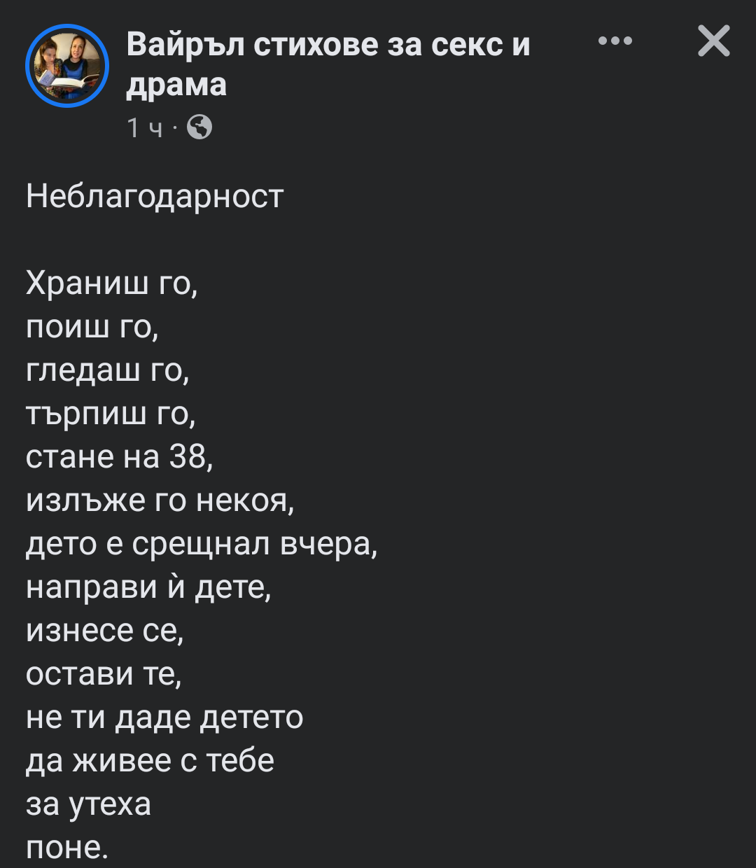 Ето за това говоря - по подразбиране се приема, че някой някого ще изнудва и пак, и пак, и пак. Защо, за бога, с рогите, защо сте наострени, че непременно искат да ви се качат на главата? Вярно, уважение не се купува, но не ви ли се случва да искате да зарадвате някого безкористно? Защо виним хората за времето и средата в която са израснали и са формирали разбиранията им? Освен това се закачихте за пост, но си го тълкувате свободно - баба, дядо, баща, които заплашват и са императивни да го ду.хат, това не подлежи на коментар. Те не са хората на които да разчиташ. Говоря ви, че сега, за да докажат мястото си (а не са длъжни пред никого), много млади дами влизат в конфронтация ненужно.