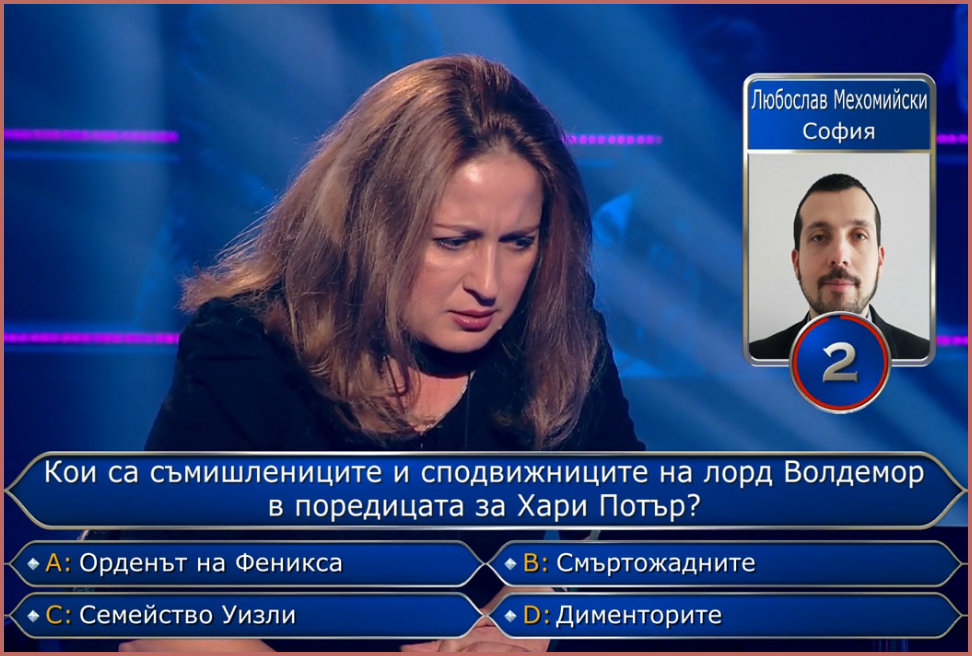 Вчера на въпроса за Хари Потър ММ предположи, че жокерът е чул нещо от сорта: поддръжници и Хари Потър и не е разбрал добре въпроса. Сега не знам дали е така, ама е възможно да има недочуване и недоразбиране понякога.