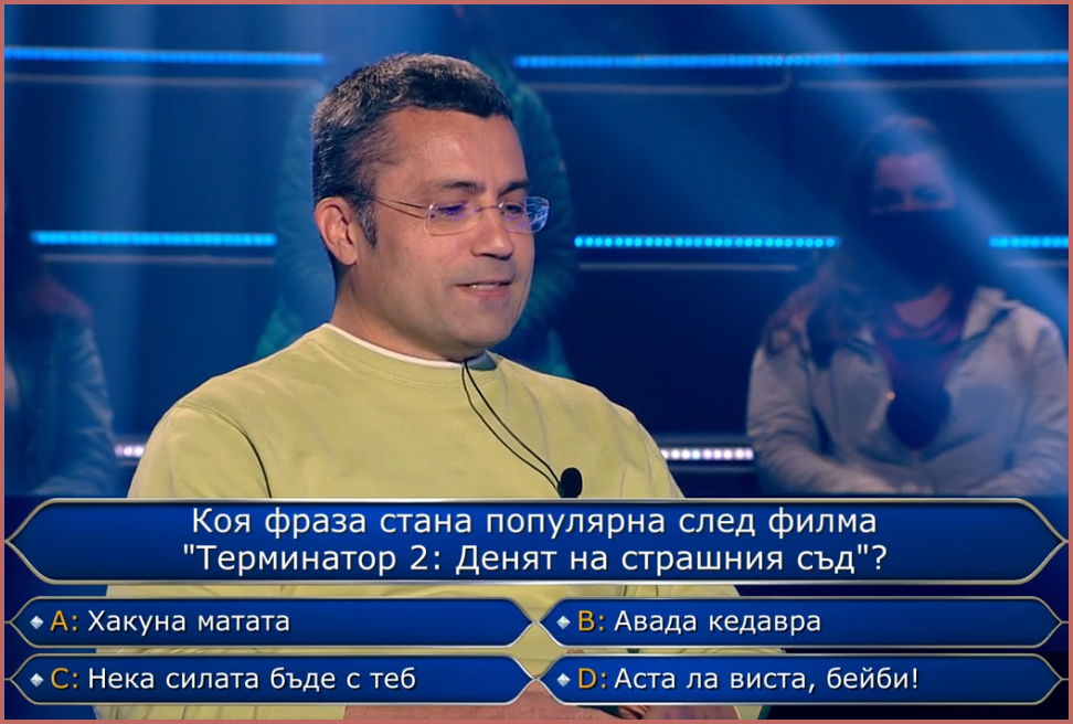 Но ако ти се падне труден въпрос, за който нямаш никаква представа, и имаш два жокера, според мен е по-добре да се обадиш първо на приятел. Голям или малък, но има шанс той да ти каже верния отговор или да те насочи. Ако пък не знае или не е сигурен, това остава 50:50. Така имаш шанс да успееш само с един жокер. Ако направиш обратната поредност и наистина нямаш представа от отговора, със сигурност отиват два жокера.