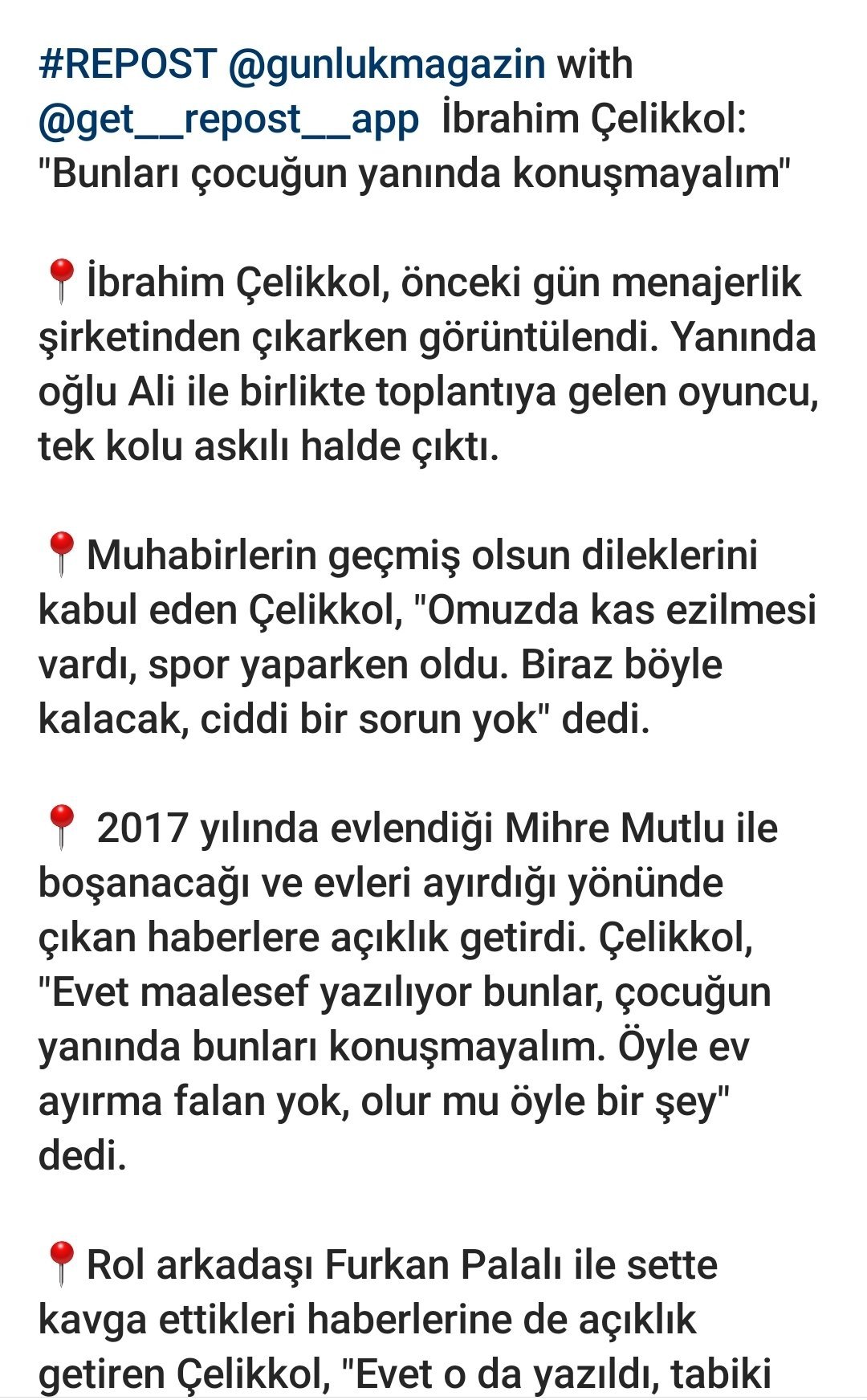 "Вчера Ибрахим Челиккол е видян от репортери на излизане от мениджърската си компания. Актьорът, който бе дошъл заедно със сина си Али, се оказа с превързана дясна ръка. Челиккол, приемайки пожеланията на репортерите за бързо оздравяване, поясни, че е получил мускулно разтяжение в раменната област по време на спортна тренировка и каза: "Ще остане обездвижена за известно време, но няма сериозен проблем".
