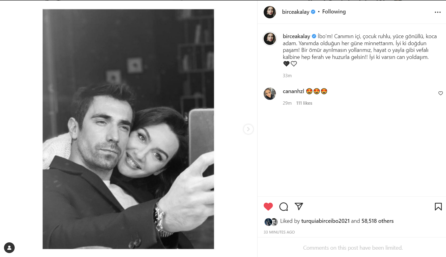 Поздрава на Бирдже Акалай-"Мой Ибо!Скъпи мой, с детски дух, великодушен, голям мъж. Благодарен съм за всеки ден, който си с мен. Честит рожден ден паша мой! Нека пътищата ни не се разделят за цял живот, нека животът винаги идва във вашето лоялно сърце като тази планина в мир и уют!! Добре че те има, скъпи мой другарю.