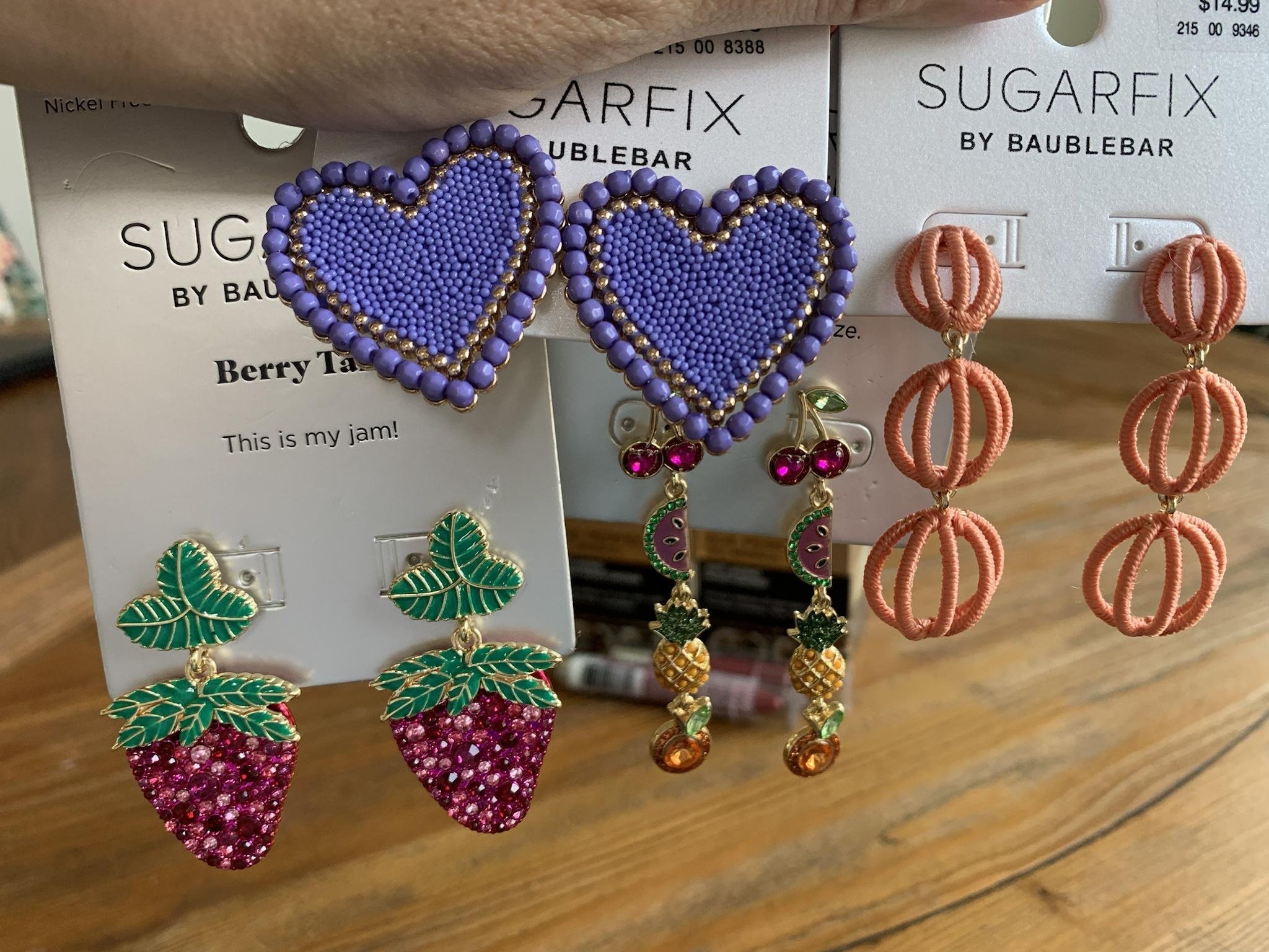4 чифта обеци от Sugarfix (имат безумно сладки моделчета) .Вече имам над 40 вида .Нося непрекъснато и всякакви модели,материали.Без обеци,за мен едно лице не е завършено и стои празно.