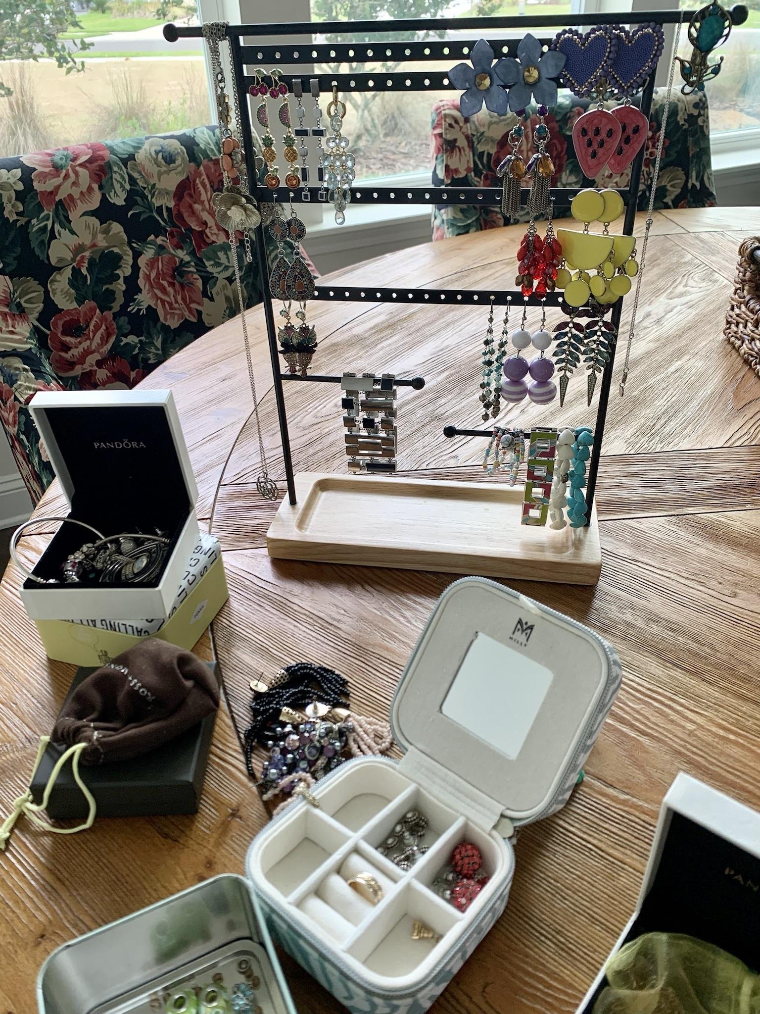 Има капацитет от 80 дупки,тоест 40 чифта обеци,място за гривнички.