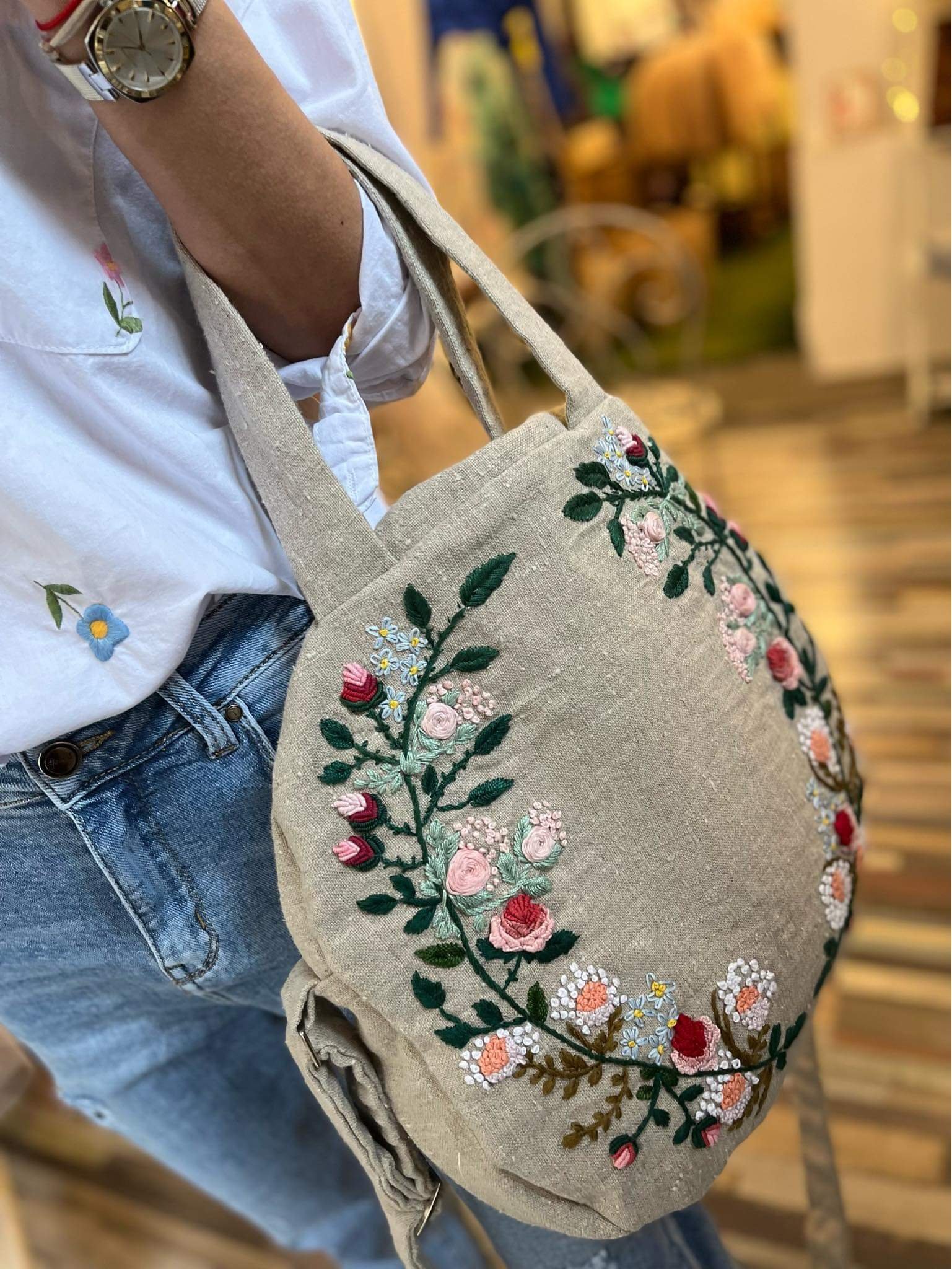 Пенелопе, чантата е поръчана от една страничка във Фейсбук, Vintage House Boutique. Имаха публикация преди време с подобна чанта. Питах дали могат да ми изработят същата. Знам, че е шита и бродирана в ателието.