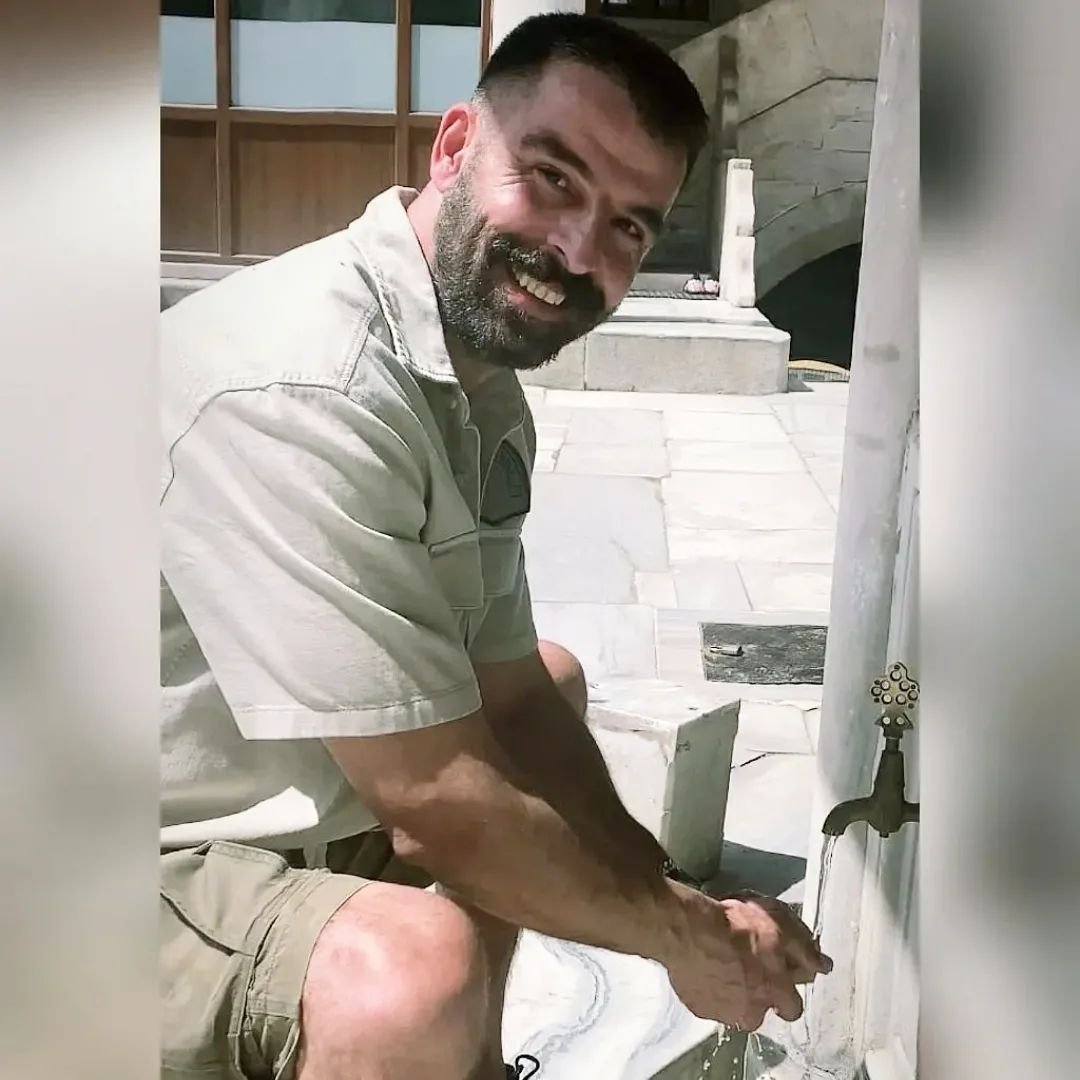 Намалил е косата и брадата и прилича на човек. Мие се на малка чешмичка, каквито има пред всяка джамия. Вероятно се кани да влезе вътре. Той ходи на джамия и се подготвя да влезе  след като се измие.