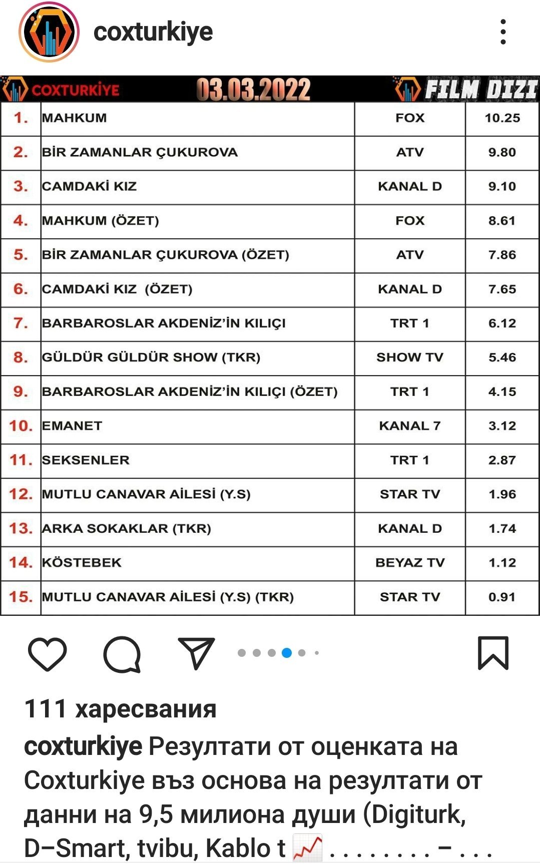 А това е рейтингът, измерен по брой зрители на кабелни телевизии и дигитални платформи: