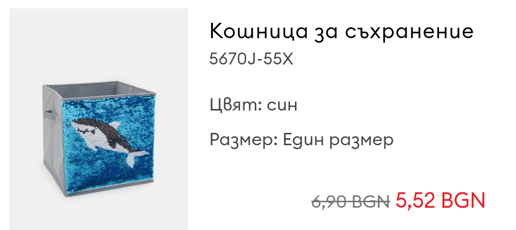 Кошница за съхранение "Акула"... Дойде само с една дръжка, за разлика от кошница "Кола", която имаше дръжки. Не знам дали е дефект. Самите кошници, обаче, имат дъно от много тънък картон. За 5 лв толкова...