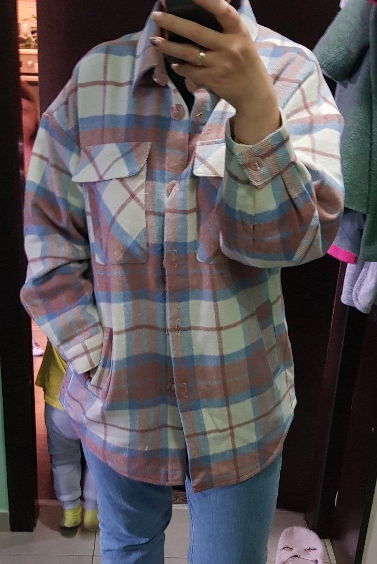 Връхната риза с вълна е страхотна. Овърсайз е. Взех размер М, но и С щеше да е супер. Много е мекичка на допир. За по-топлите пролетни дни ще е идеална.