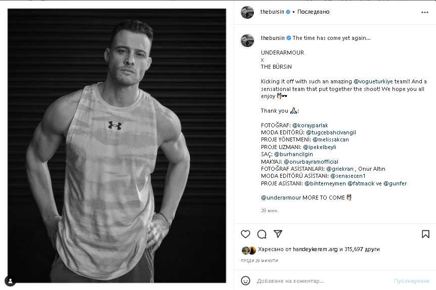 Има промяна във визията определено - харесва ми. Скъсил е косата и брадата, направил е пак мускули (без да е прекалено). Изглежда ми подмладен. Но в погледа му се чете някаква носталгия и тъга (лично мнение). Аз съм от тези, които не обичат да търсят Керем в отраженията на снимките на Ханде и обратното, подкрепям и Налбантова относно това, че те са актьори и ни показват това, което преценят, и няма как да знаем това техните погледи ли са или не. Но си споделям мнение. Стислам палци всичко да е наред и при двамата. Hands Pray