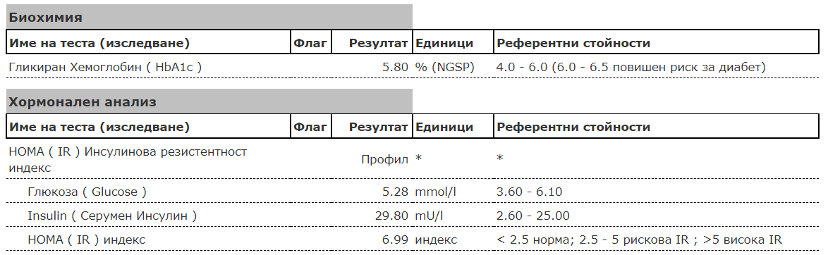 stz2, НОМА индексът ти го сметнах 3,9, инсулинова резистентност си е. Формулата е глюкоза на гладно х инсулин на гладно / 22,5, т.е. 17,8*4,97/22,5.