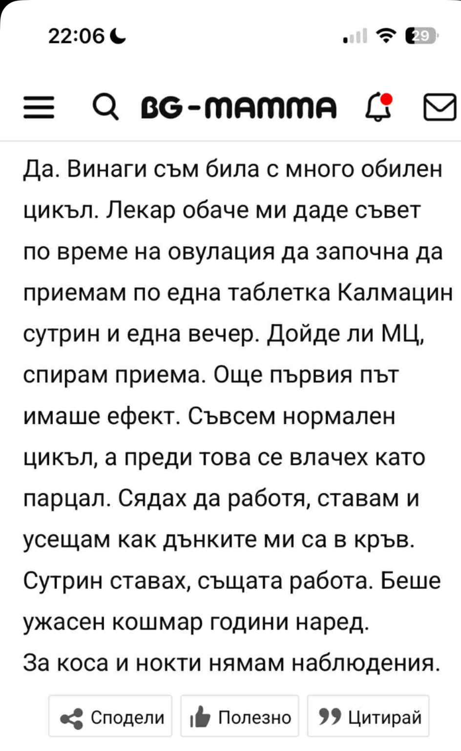 Повърждавам за вечерната иглика, при мен също нямаше ефект. Пих я 2 години. Cry Според АГ, единственото решение е хормонална спирала. Лошото е, че последните години цикъла става все по-обилен и това пречи на нормалния ми живот в първите два дни на менструацията. Добре че работя от вкъщи, иначе не знам как щях да ходя на работа. Доста често се замислям относно спиралата, но за момента не съм взела решение да слагам такава. Преди 3г чашките ме спасиха, защото поне 3, 4 часа нямам необходимост от тоалетна, докато с тампон супер, максимума ми беше 1 час.