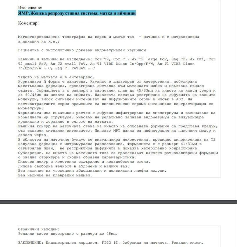 Отглеждам миоми от 10 години. Имам една хистероскопска операция за премахването на един възел, който висеше на краче в кухината на матката. Ходех редовно на 6м за проследяване. Този възел, заради който сега се налага операция се появи през август 2021г. Поради различни обстоятелства пропуснах гинеколога последната година и половина. Оказа се, че от 4мм е станал 8см, ако правилно разчитам размерите на снимката, заема цялата кухина на матката и е смесен тип - субмукозен интрамурален. През тази година и половина нямах никакви индикации за проблем. На 18.02 ми дойде цикъла, но вместо оскъден и безболезнен той беше обилен, съпроводен с много силни контракции, болки в кръста, гадене и виене на свят. На 4тия ден вдигнах и температура. Същия ден отидох при гинеколога си, който работи в Надежда. Лекарят беше в шок от това, което видя на ехографа. Извика да ме прегледат и консултират още 4ма лекари, включително завеждащата онкогинекологията. Стигнаха до заключение, че се касае за голяма миома, която притиска силно матката отвътре и така нарушава храненето си и за това некротизира. От това е възпалението, Т и повишеното ЦРП. Категорични са уж, че не се касае за злокачествено образувание, но това само патолога може да го заяви със 100% сигурност. Не са ми пускали туморни маркери, но те могат да се повишат и от едно обикновено възпаление. Чудя се дали да не отида утре да пусна едни в Цибалаб за всеки случай.