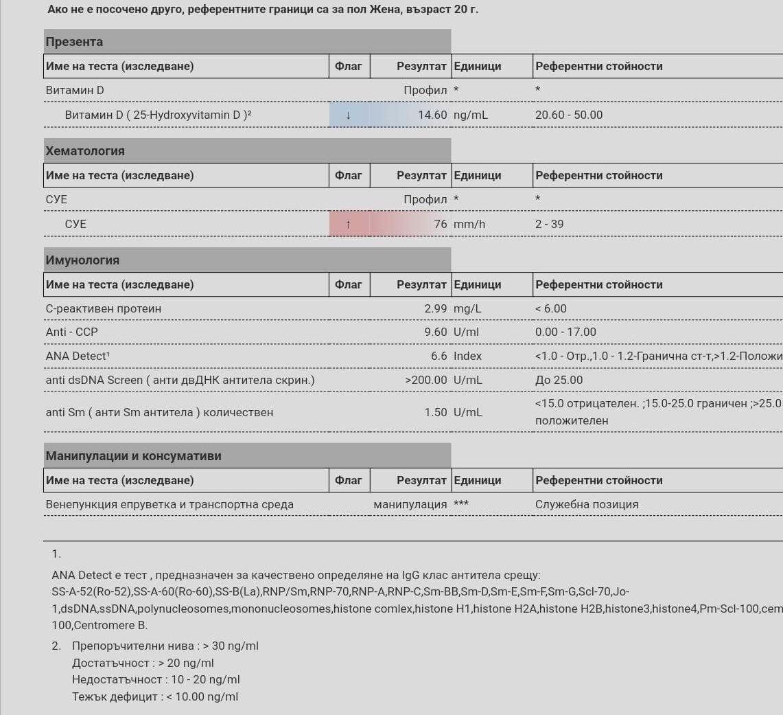 Здравейте, искам и аз да се включа в темата с въпрос. На 20г. съм и от половин година, че и малко повече имам болки в ръцете, краката, главоболие, подувания, обриви, и др. Ходих на ревматолог декември според него най- добре било да ходя да си играя някъде, сега пак посетих ревматолог и ми назначиха тези изследвания, които видимо според мен не са в норма - дали може някой да изрази мнение, тъй като на вторичен преглед съм чак след седмица?!
