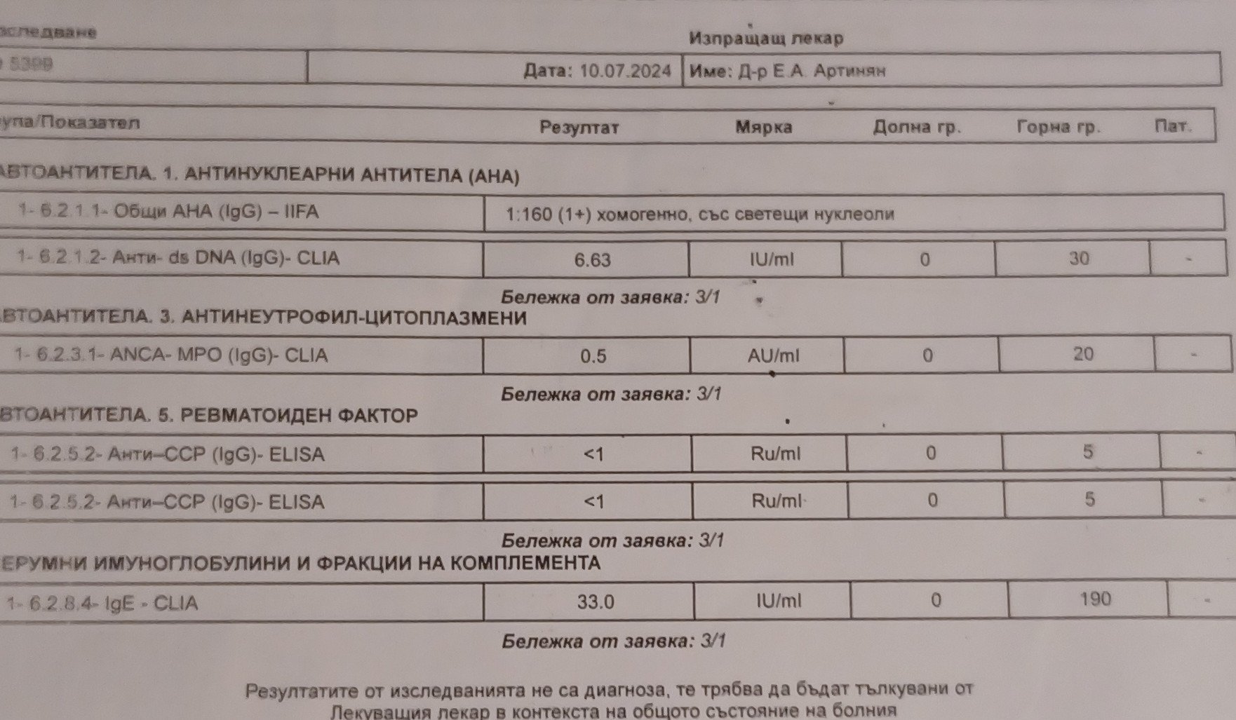 При мен също беше отрицателно, но съм със серонегативен РА. Така, че @Lavaca, много неща се гледат освен кръвните показатели. Не се наема никой да казва нищо за вашите изследвания, защото е като фърляне на боб. Това, за което може да се радвате, е че показателите са ви в норма. Но пак казвам при серонегативния РА тези точно не са критерий. Така, че проявете търпение, не се филмирайте и изчакайте становището на лекаря си. Успех!