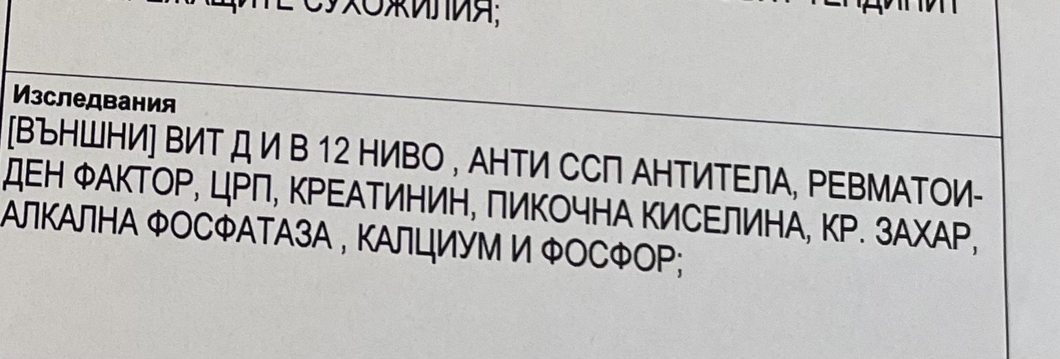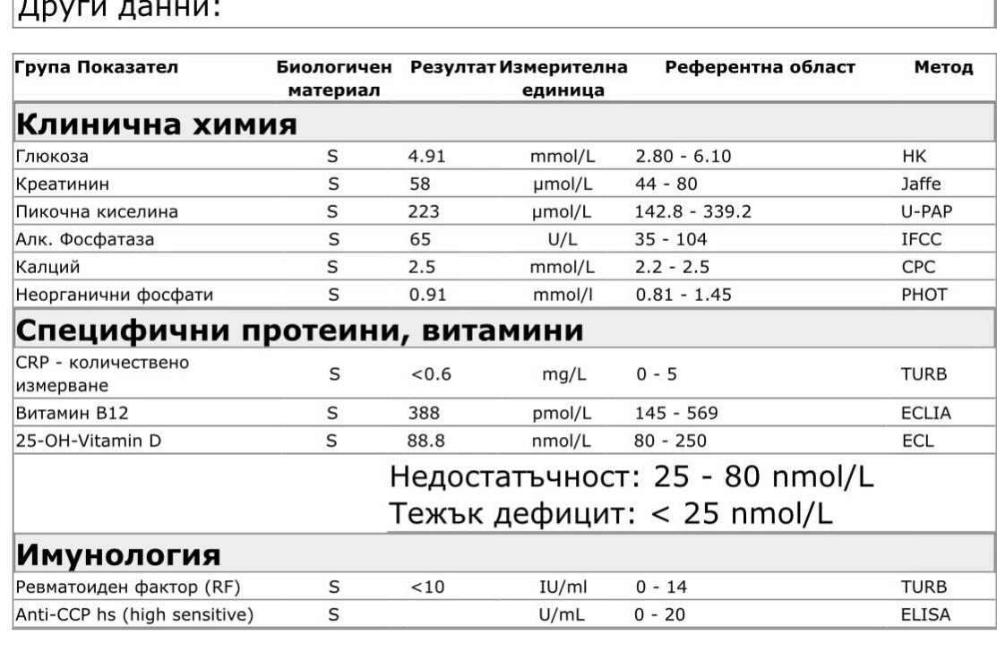Здравейте, пак съм аз, бях на ревматолог и му пусна следните показатели от снимката плюс преглед с ехограф на проблемните стави ми направи.