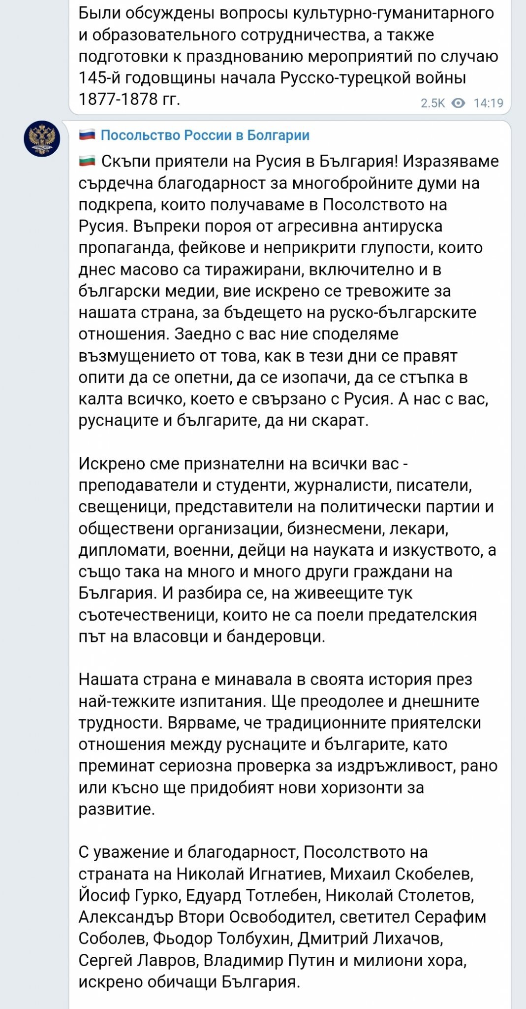 Там си е. Влез в страницата на посолството във фейсбук. Един пост за благодарност на подкрепилите ги от страната на хора, които обичат България - Столетов, Гурко, Тотлебен, отец Серафим.... Лавров и Путин.