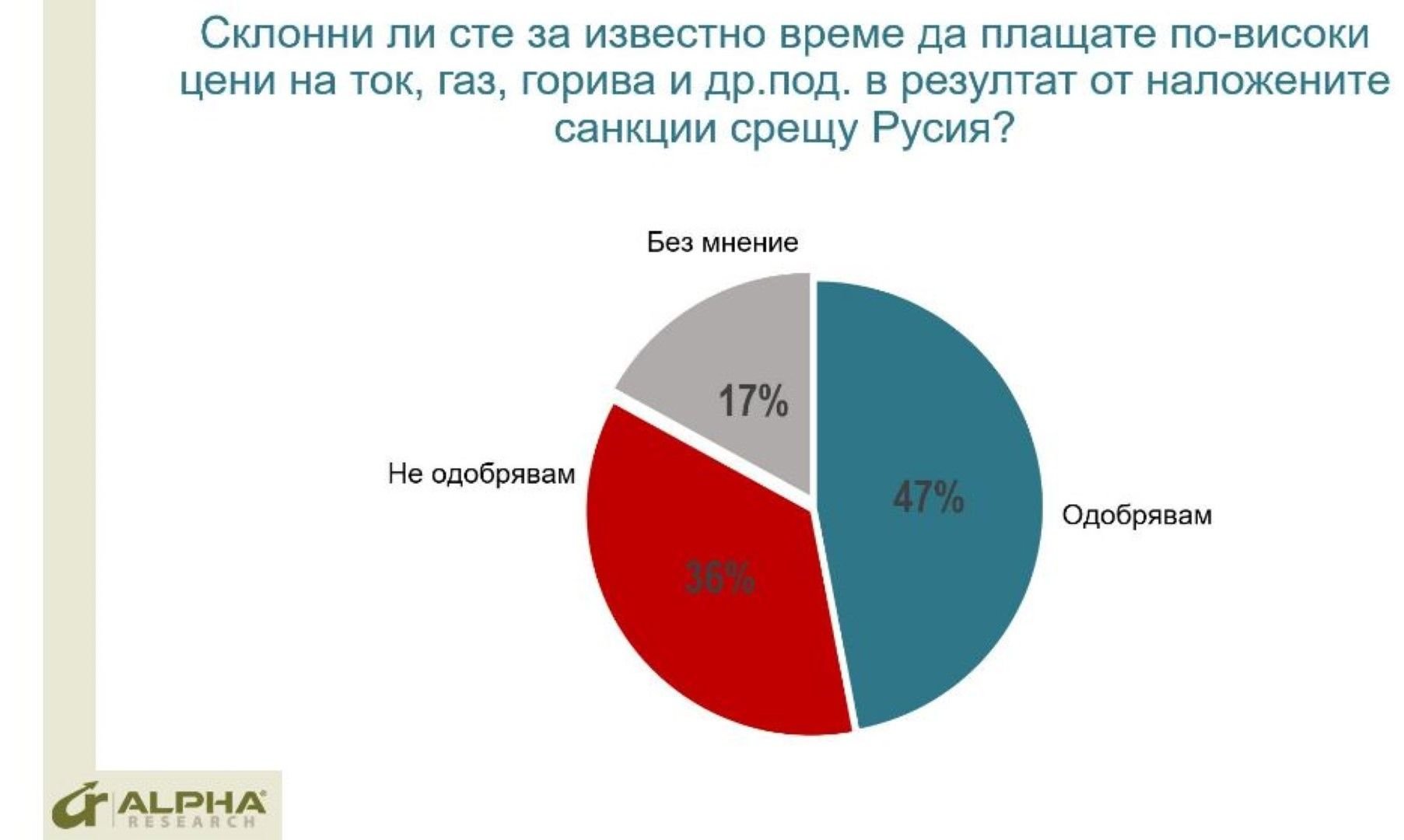 "Склонни ли сте за известно време да плащате по-високи цени на ток, газ, горива в резултат от наложените санкции срещу Русия?" -пита Алфа Рисърч. И 47 % "самоотвержено" отговорили с "Одобрявам". Sweat SmileSweat SmileSweat Smile