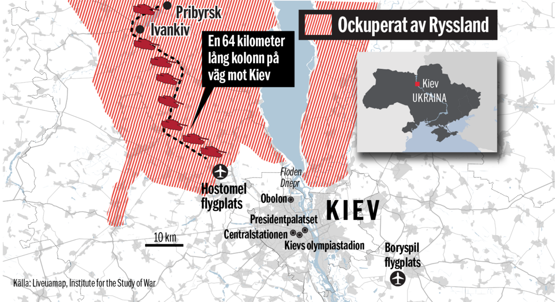 Картата по-долу показва каква е ситуацията в Украйна в момента и как руският конвой наближава Киев. В шведския форум коментират, че след намесата на ЕС с оръжие, с което наля масло в огъня, Путин вече воюва и срещу ЕС, т.е. това още повече го настървява и няма да се откаже, дори напротив - ще втърди военните действия, защото няма какво повече да губи.