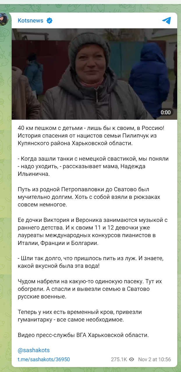 "40 км пеша с деца - само и само до своите, до Русия! Историята за спасяването от нацистите на семейство Пилипчук от Купянския район на Харковска област. „Когато влязоха танковете със свастика, разбрахме, че трябва да си тръгнем“, казва майка ми Надежда Илинична. Пътят от родната  Петропавловка до Сватово беше болезнено дълъг. Поне взеха много малко в раниците си. Дъщерите й Виктория и Вероника се занимават с музика от ранна детска възраст. А на 11 и 12 години момичетата вече са лауреати на международни конкурси по пиано в Италия, Франция и България. Вървяхме толкова дълго, че трябваше да пием от локви. И знаете ли колко вкусна беше тази вода! Като по чудо се натъкнали на самотен пчелин. Тук се загряват. А руските военни спасяват и отвеждат семейството в Сватово. Сега имат временен подслон, донесоха хуманитарна помощ - всичко необходимо."