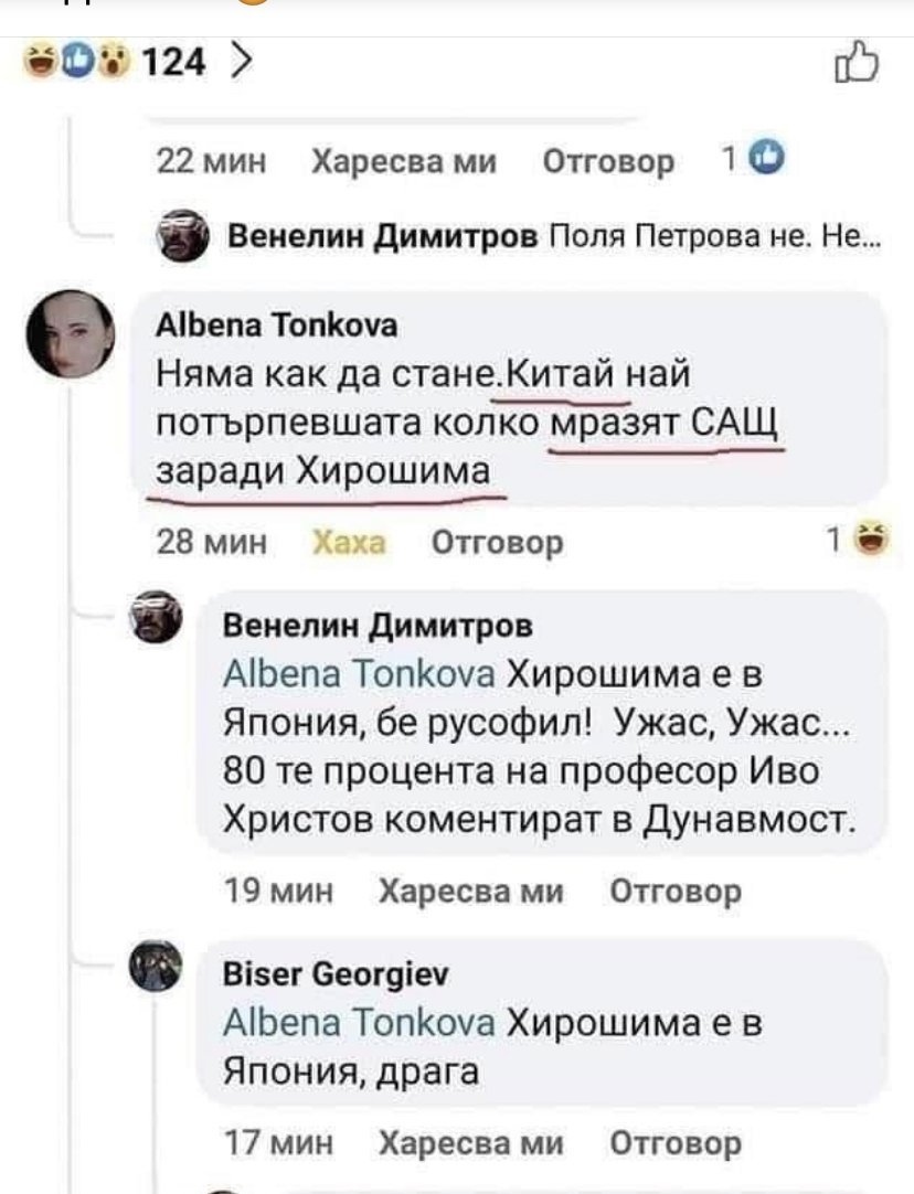 Пък една написа във фейса, че Китай щяла да подкрепи Русия, защото е най- пострадала от бомбите на гадните американци в Хирушима ... такова ниво на промит мозък и путинизъм не знам как се бие