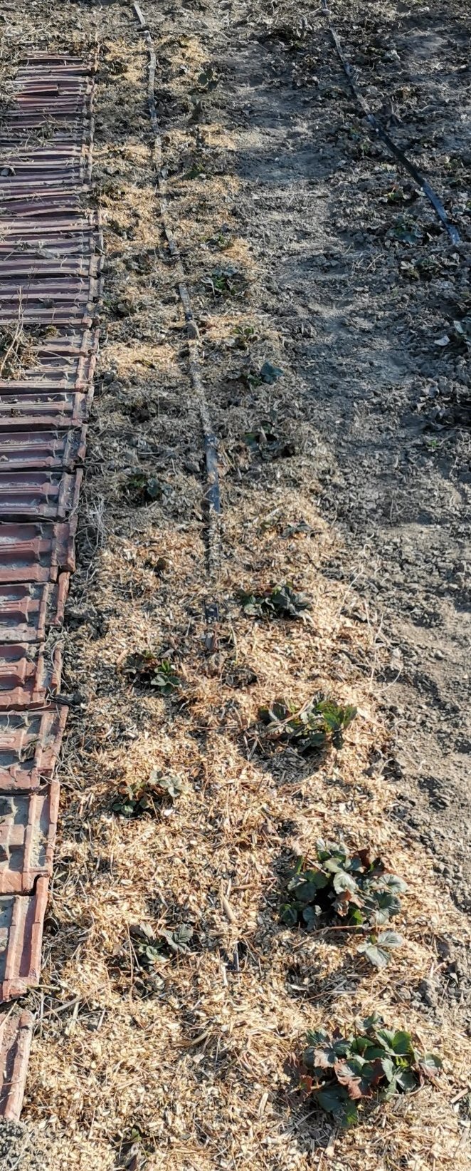 Ние успяхме да нарежем всички клонки, но не стигнаха за всички редове ягоди. На последните редове сложих съвсем символични количества на корените. Ще видим как ще им се отрази. От миналогодишното ми мулчиране има съвсем малко останала слама на четирите реда. Ягодите са в ужасно състояние, не знам дали заради неполиването през лятото или тежката зима, надявам се сега като са оправени, мулчирани и поляти да се посъживят повечето.