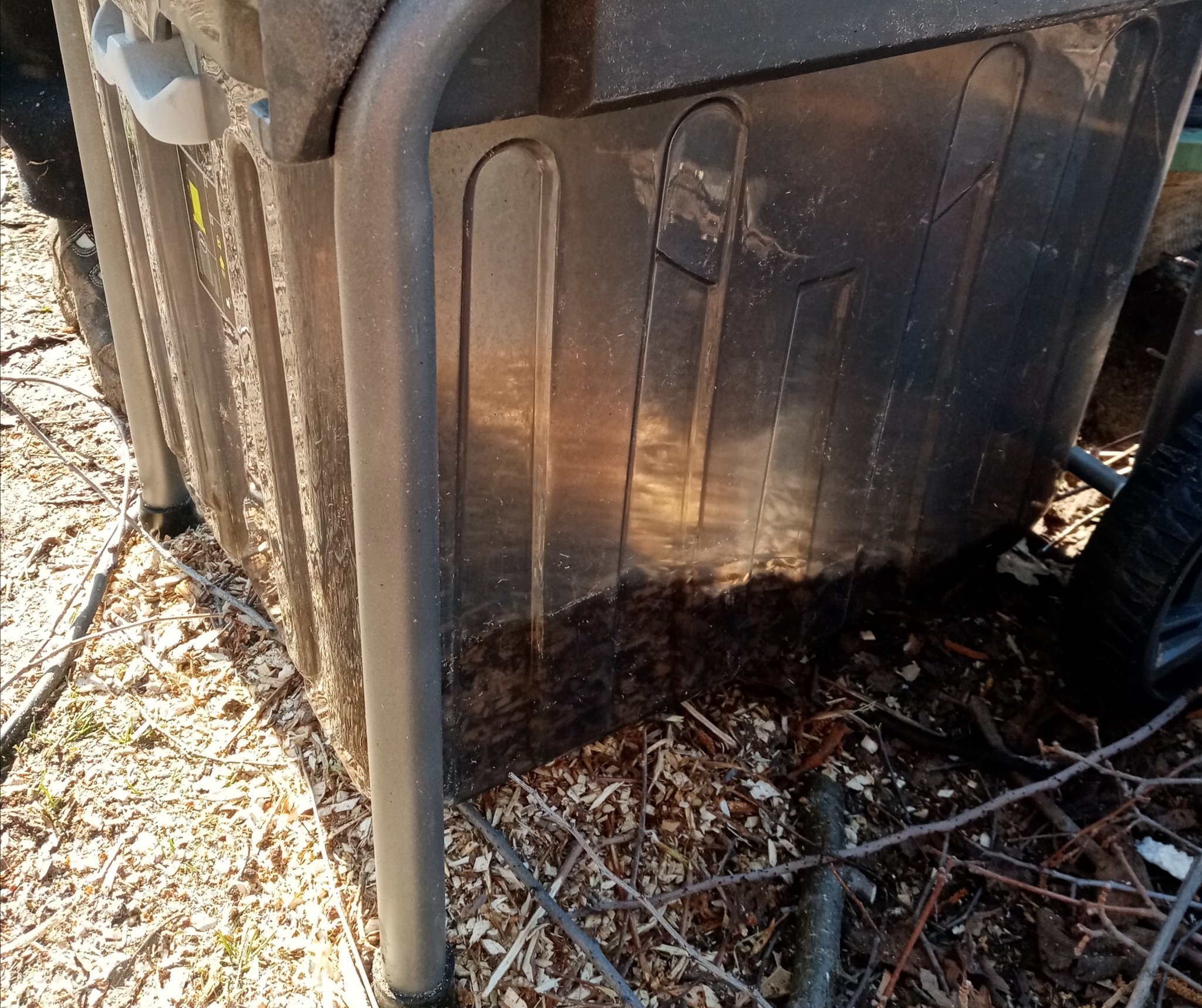 , най-долната част е отпреди няколко години, станал е като купешкия субстрат, леко по-клечесто е само, но зависи какво се слага. Купешките субстрати вече са без торф и доста им спадна плодородието, та ще се набляга на домашно. Слагаме предимно листа, малко изрезки от храсти, малко трева, малко кафяв картон, нарязана канцеларска хартия, някоя и друга огризка от ябълка, картофена обелка, яйчни черупки, и по някоя лопатка от почистването на курника, от време на време капака се оставя отворен за да влезе малко дъждовна вода. Нашите са като бидон, но най-добре става като е просто купчина на открито.