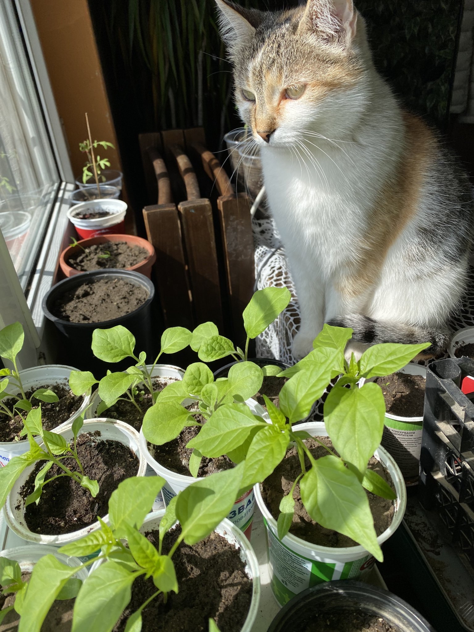 От първите чушки нищо не поникна, според мен бяха в неподхадящ съд с високи стени и недобро огряване. Днес сложих още люта кръгла саксийна чушка. Хвърлих чубрица напосоки в сандъчетата на сакъзчетата. Сложих и едно сандъче кориандър. Ягодите още им се каня. Вчера преместих 4 корена в саксии, но искам още да очистя градината. Открих, че нямам никакви марули, ще купя. Това всичко от семе, дано оцелее. В градината има изкарали магданоз и джоджен.