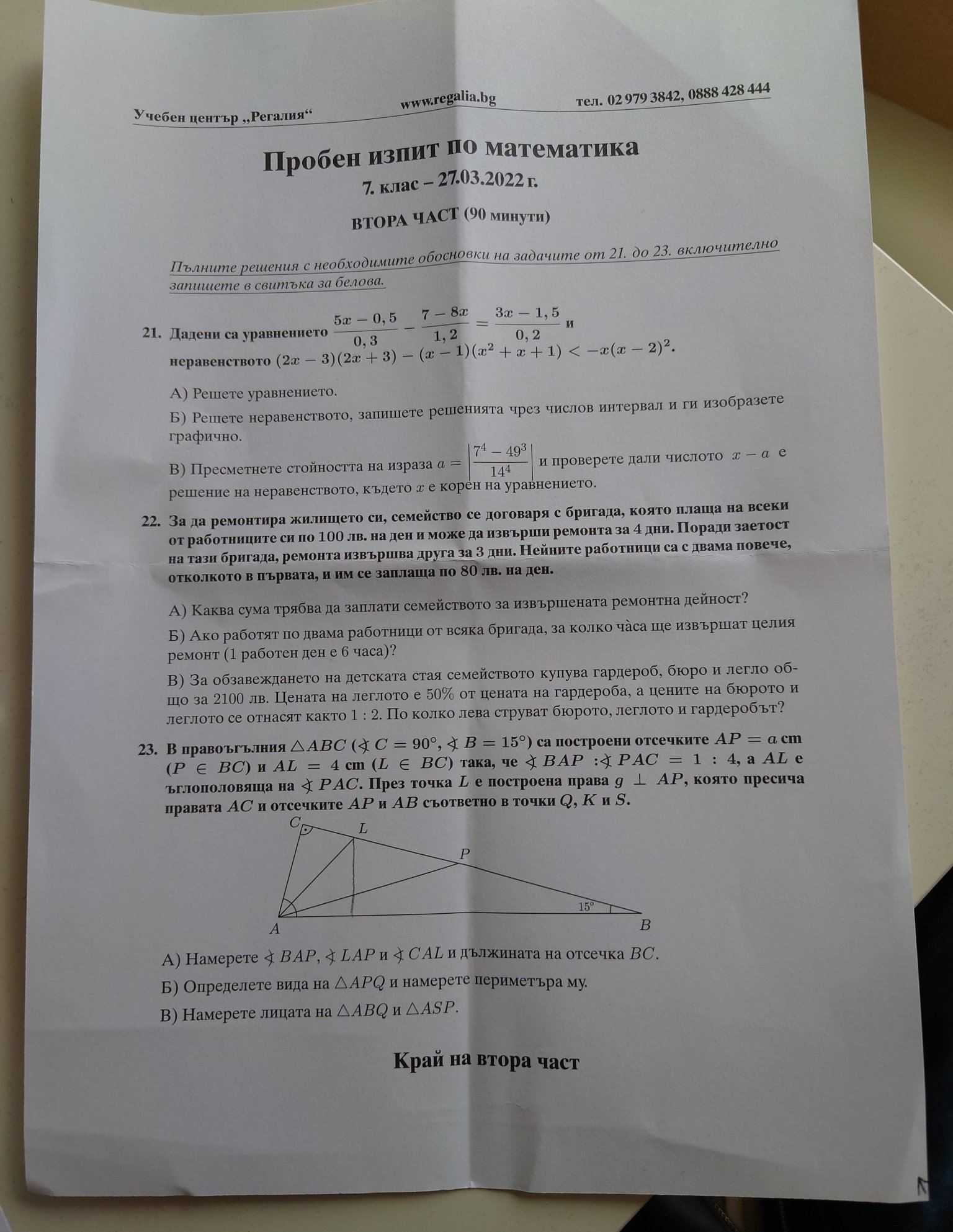 Видях ,че Регалия са качили отговорите. Първи модул 60 точки. Не й е стигнало времето да нанесе последния отговор на последната задача и 7 задача й е грешна.  Което са минус 5 точки. 7 задача е неравенство май-те не са ги взели още, така че съм доволна.